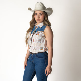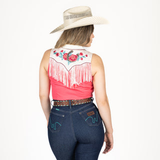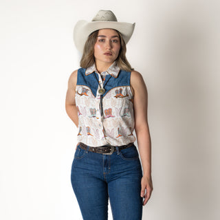 Camisa Rock & Roll Denim Sleeveless Snap Retro Pink Dama