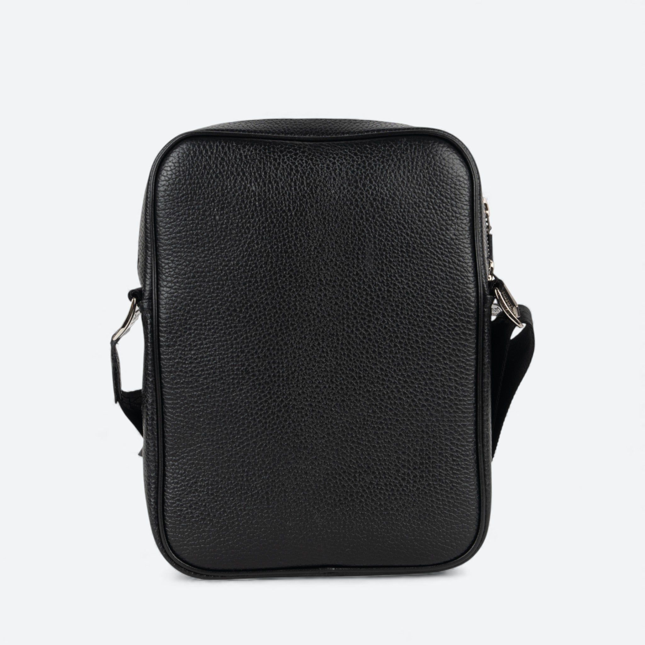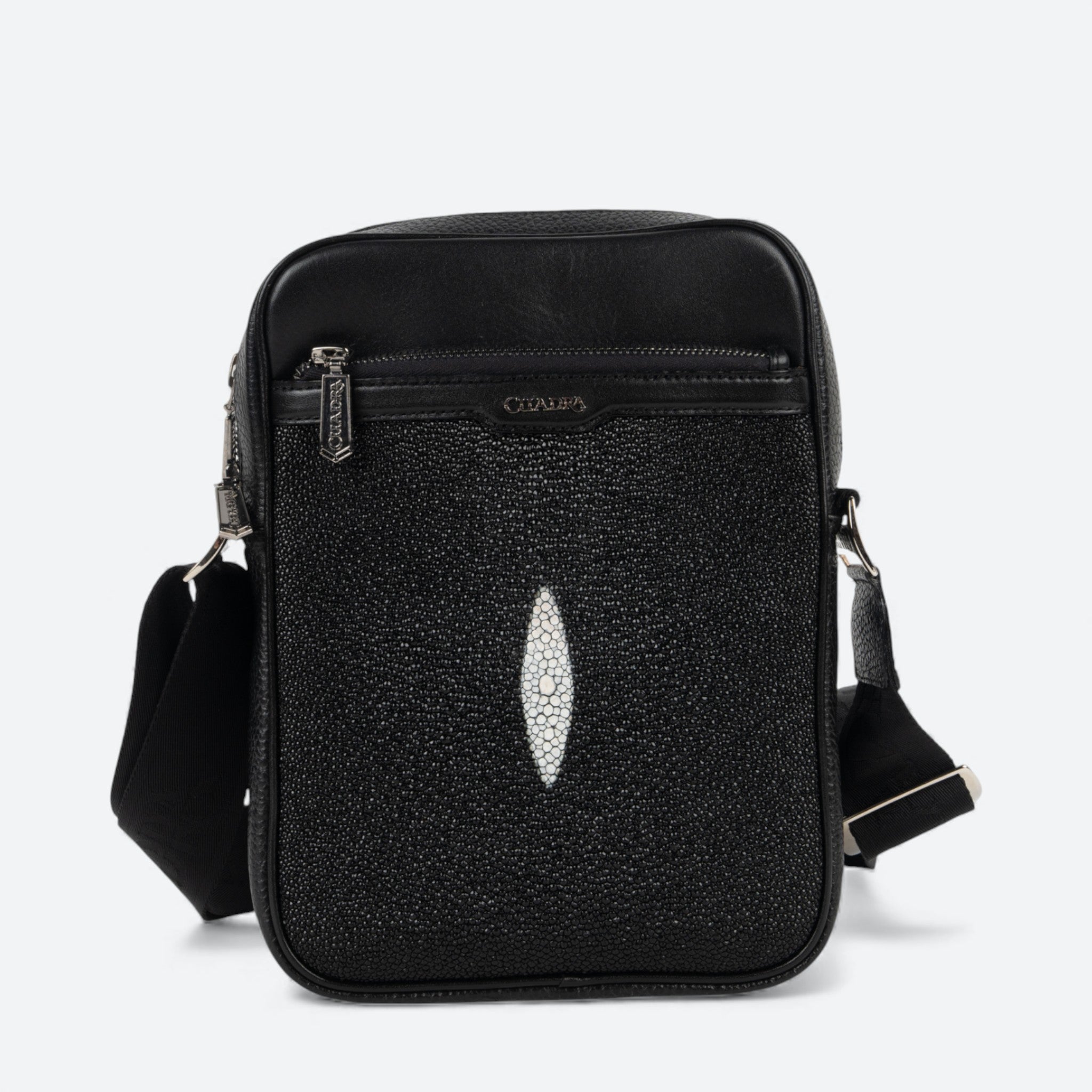 Bandolera para caballero en piel genuina de mantarraya y piel de bovino. Presenta contraste de texturas, aplicación metálica del logotipo Cuadra y acabado platinado. Con dos compartimentos asegurados con cierre, el de mayor tamaño cuenta con dos bolsillos internos. Con asa de textil ajustable.