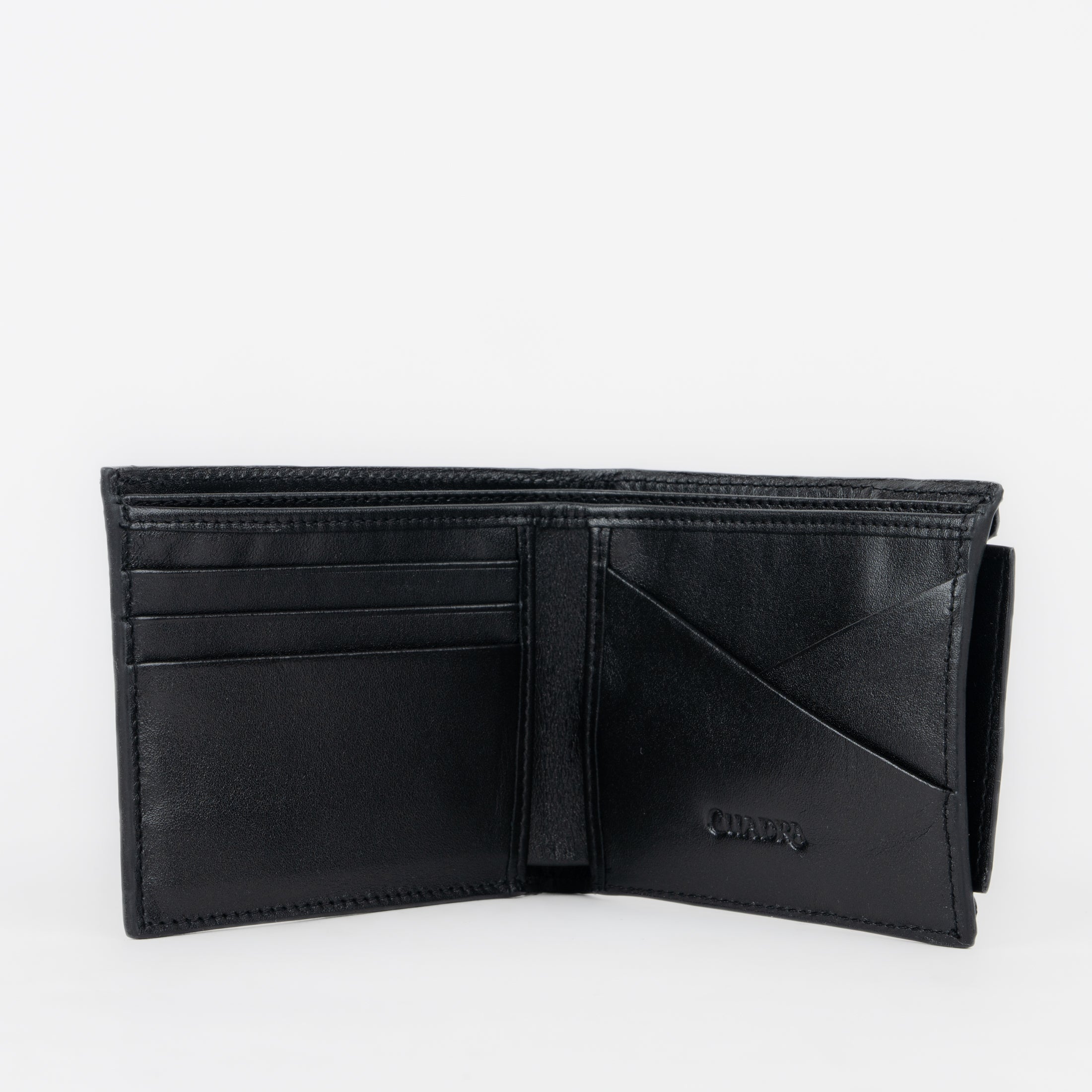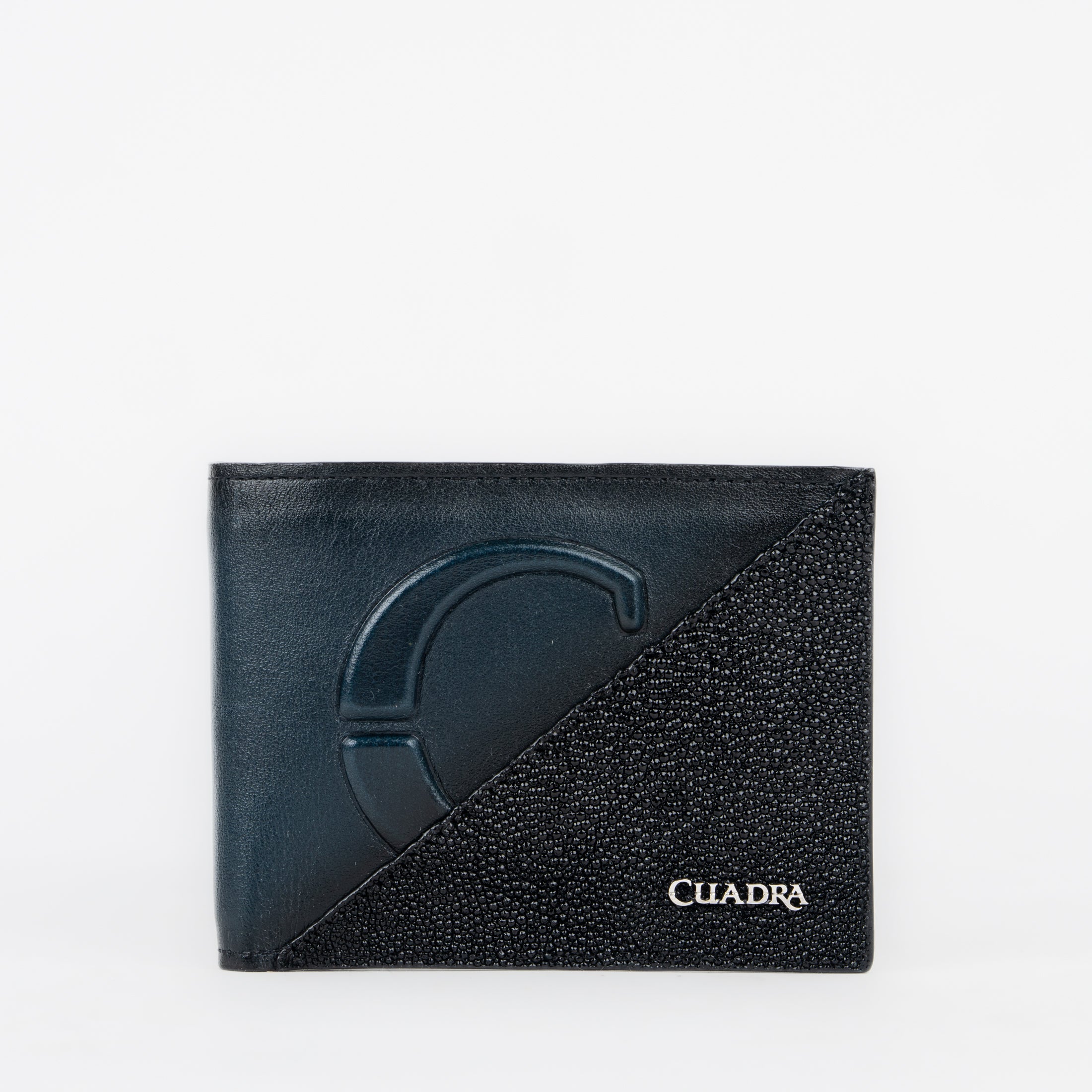 Cartera para caballero en piel genuina de mantarraya y piel de bovino. Al frente presenta grabado del monograma Cuadra en alto relieve y aplicación metálica del logotipo. En su interior cuenta con cinco espacios para tarjetas y dos espacios para efectivo. Cuenta con un tarjetero extraíble en piel de bovino con cinco espacios para tarjetas.