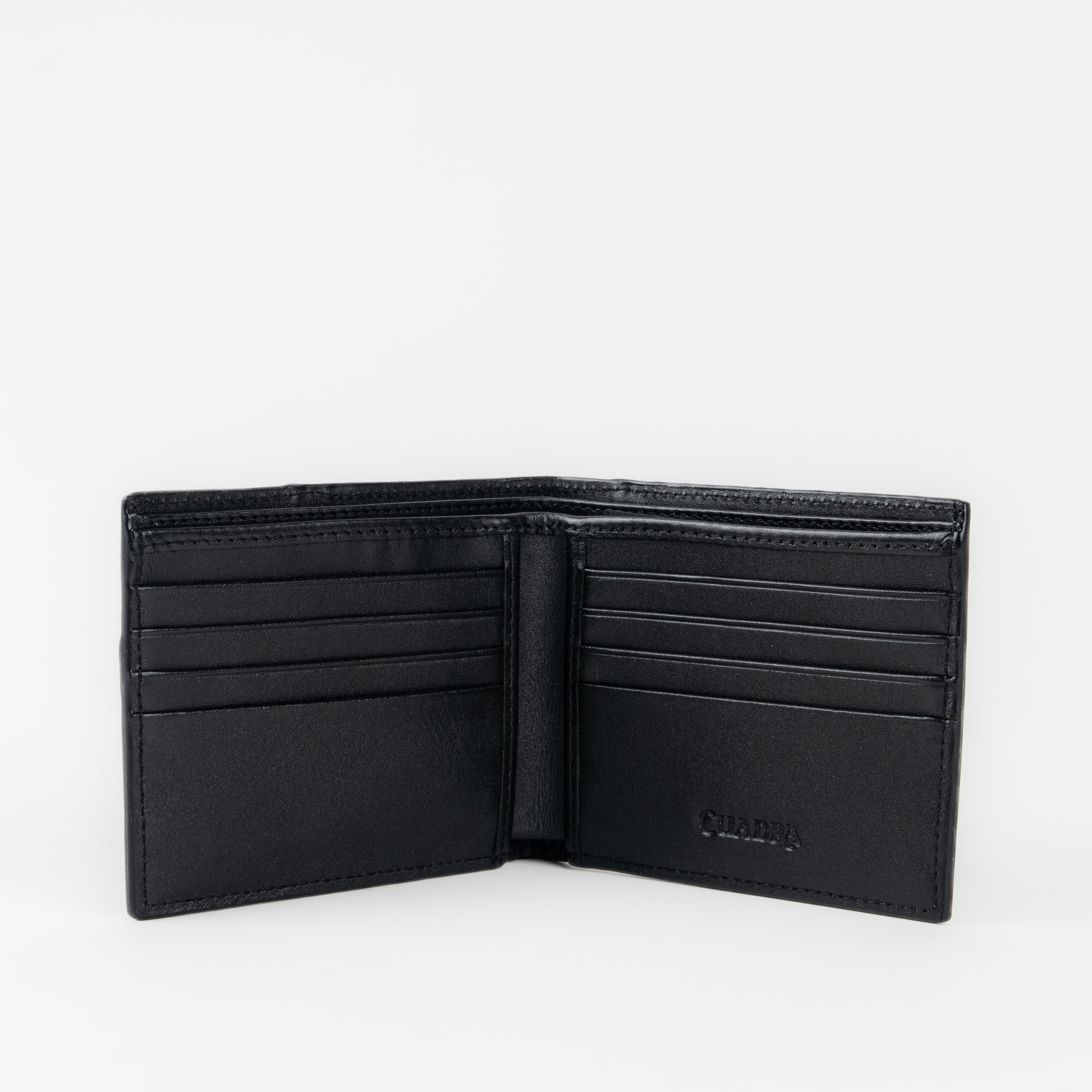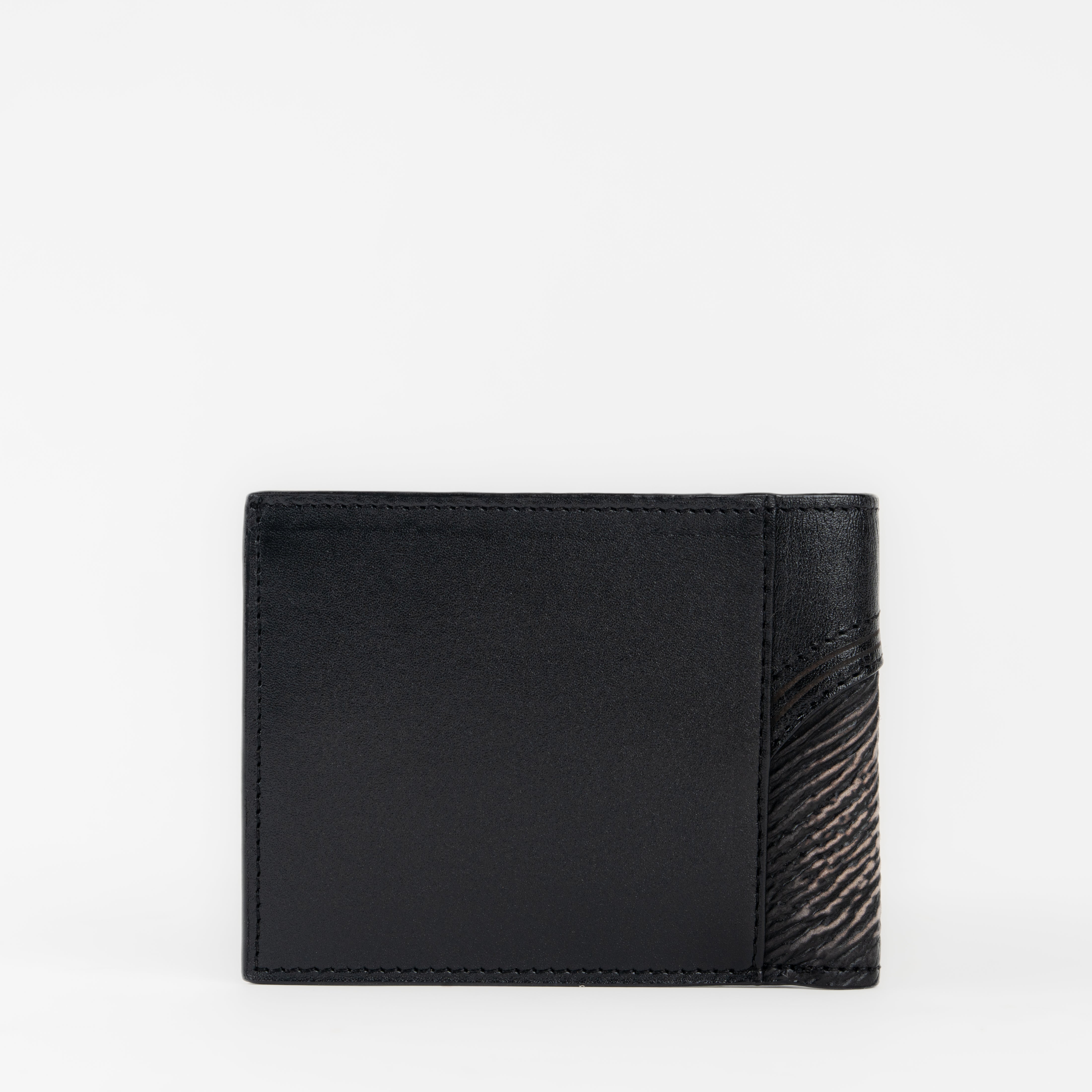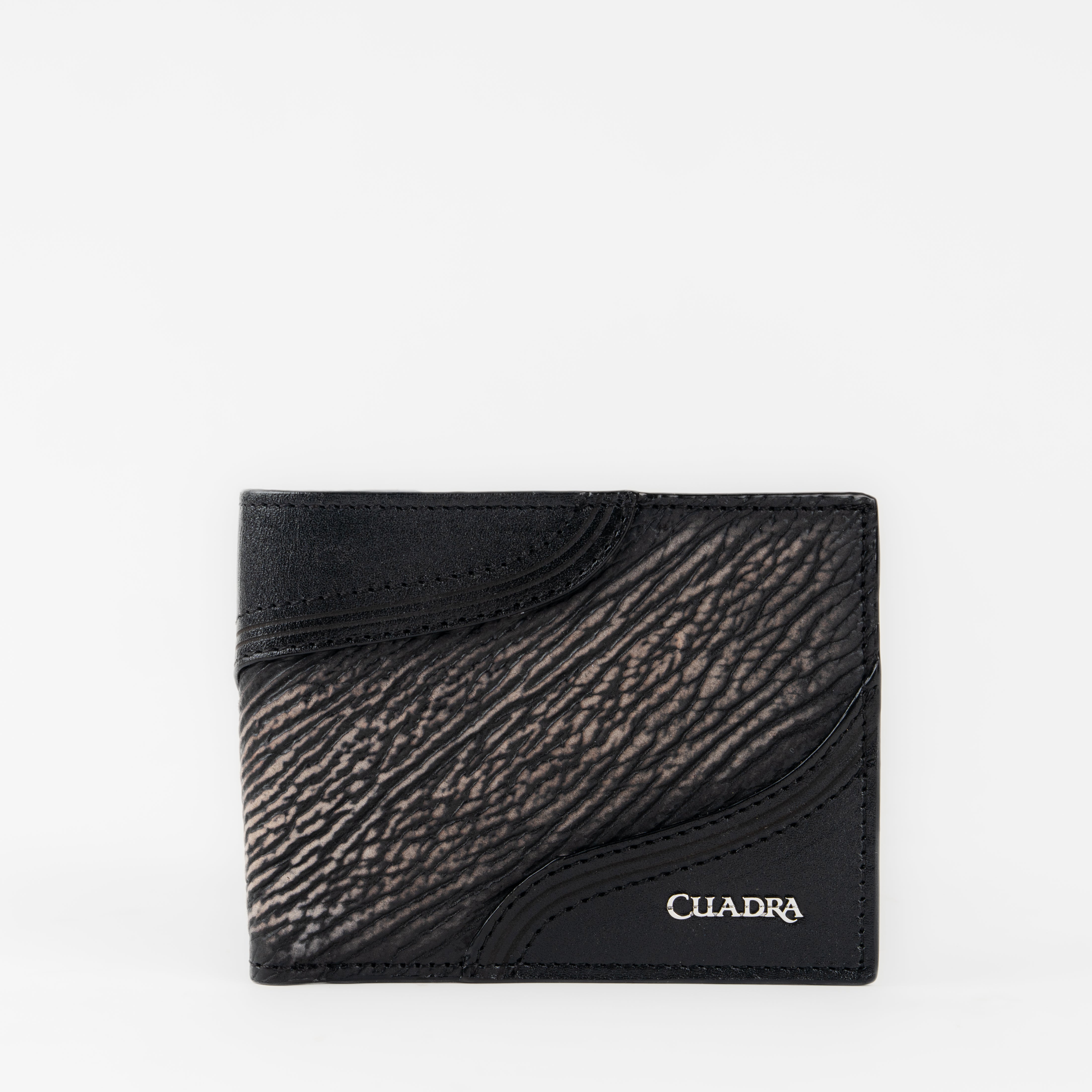 Cartera en piel genuina de tiburón y piel de bovino para caballero. Al frente presenta aplicación metálica del logotipo Cuadra, tejido y grabado láser en motivos orgánicos. En su interior cuenta con ocho espacios para tarjetas y dos espacios para efectivo.
