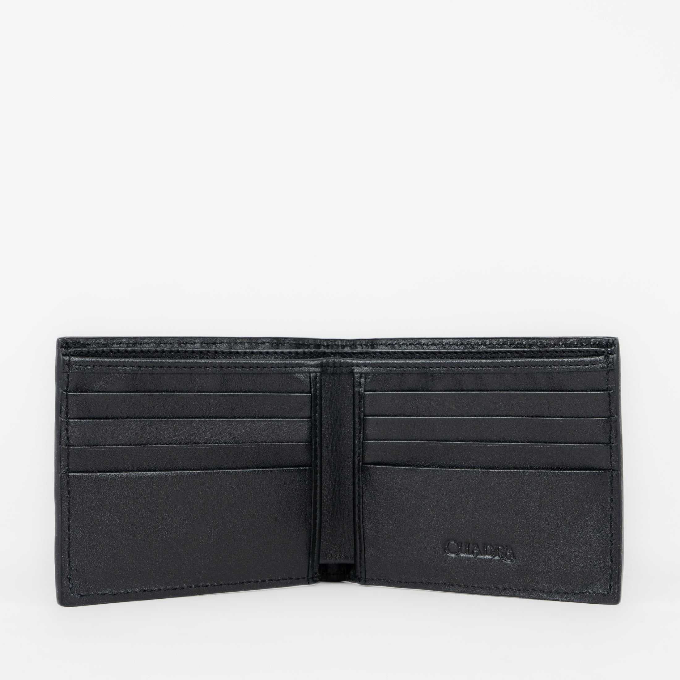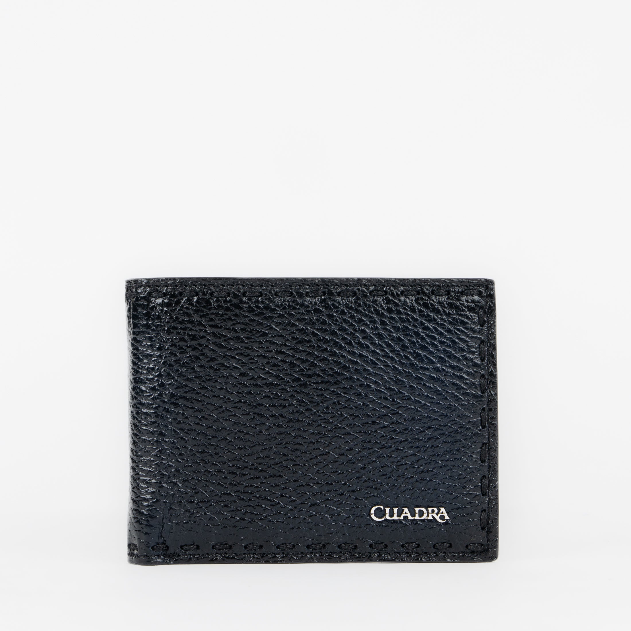 Cartera en piel genuina de venado para caballero. Al frente presenta detalles de tejido artesanal y aplicación metálica del logotipo Cuadra. En su interior cuenta con grabado del logotipo, ocho espacios para tarjetas y dos espacios para efectivo.