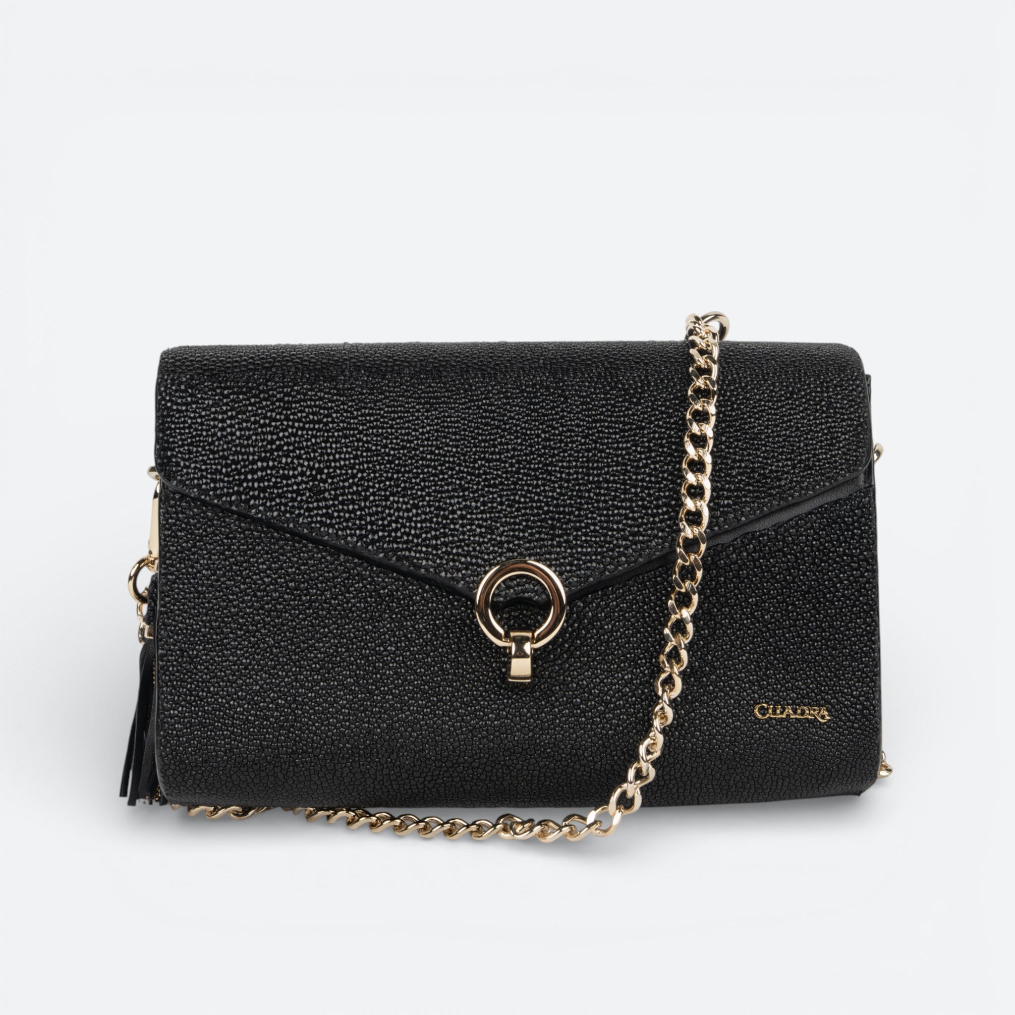 Bolso clutch para dama en piel genuina de mantarraya y piel de bovino. Presenta aplicación metálica del logotipo Cuadra, al costado una borla colgante en piel de ovino con finas cadenas y aplicación en piel de mantarraya. Con un compartimento interno. Asa de cadena con piel genuina, desmontable. Asegurado con broche.