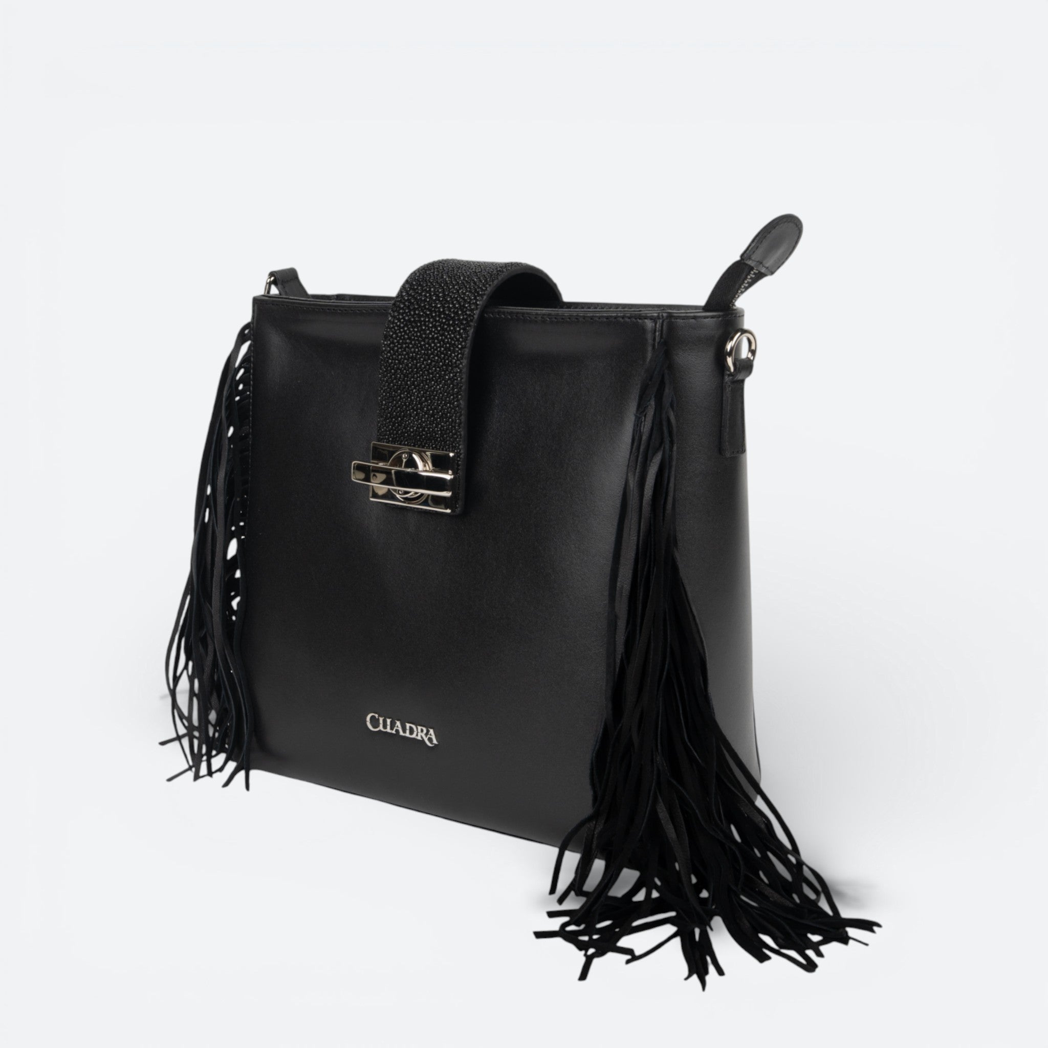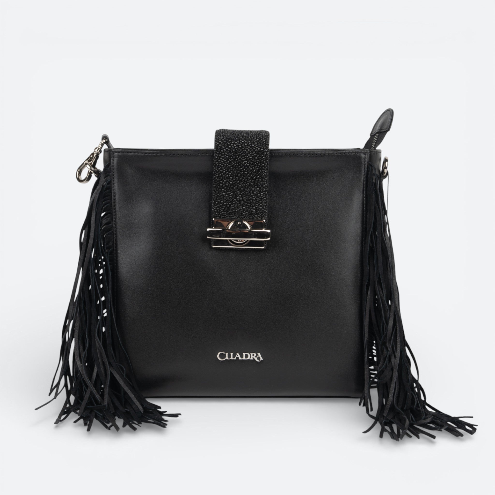 Bolso estilo western para dama en piel genuina de mantarraya y piel de bovino. Al frente presenta aplicación metálica del logotipo Cuadra. Con flecos en piel genuina de ovino a los costados. La parte trasera cuenta con un bolsillo con imán y el interior con un compartimento. Asa larga ajustable y desmontable. Asegurada con correa en piel de mantarraya sujeta con broche.