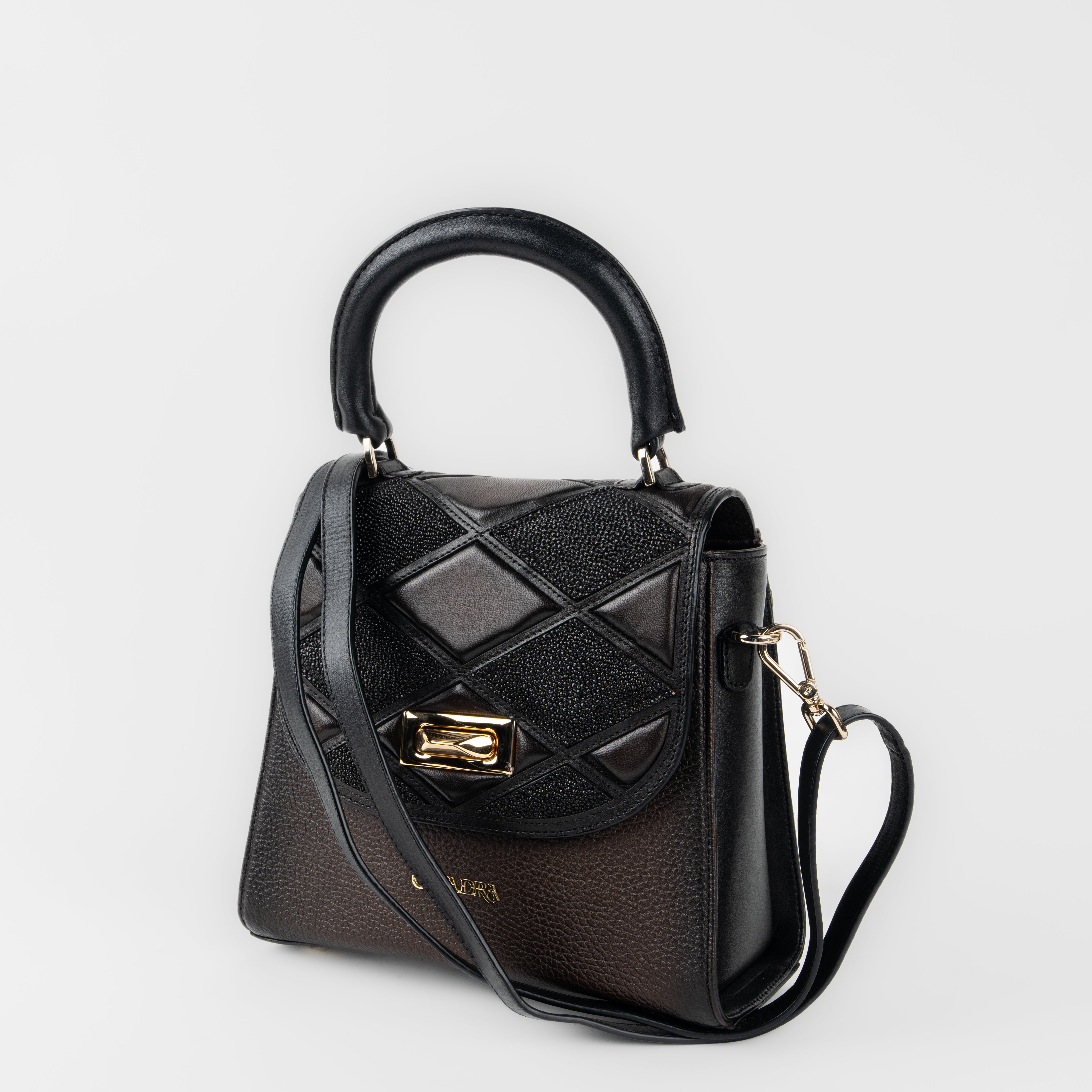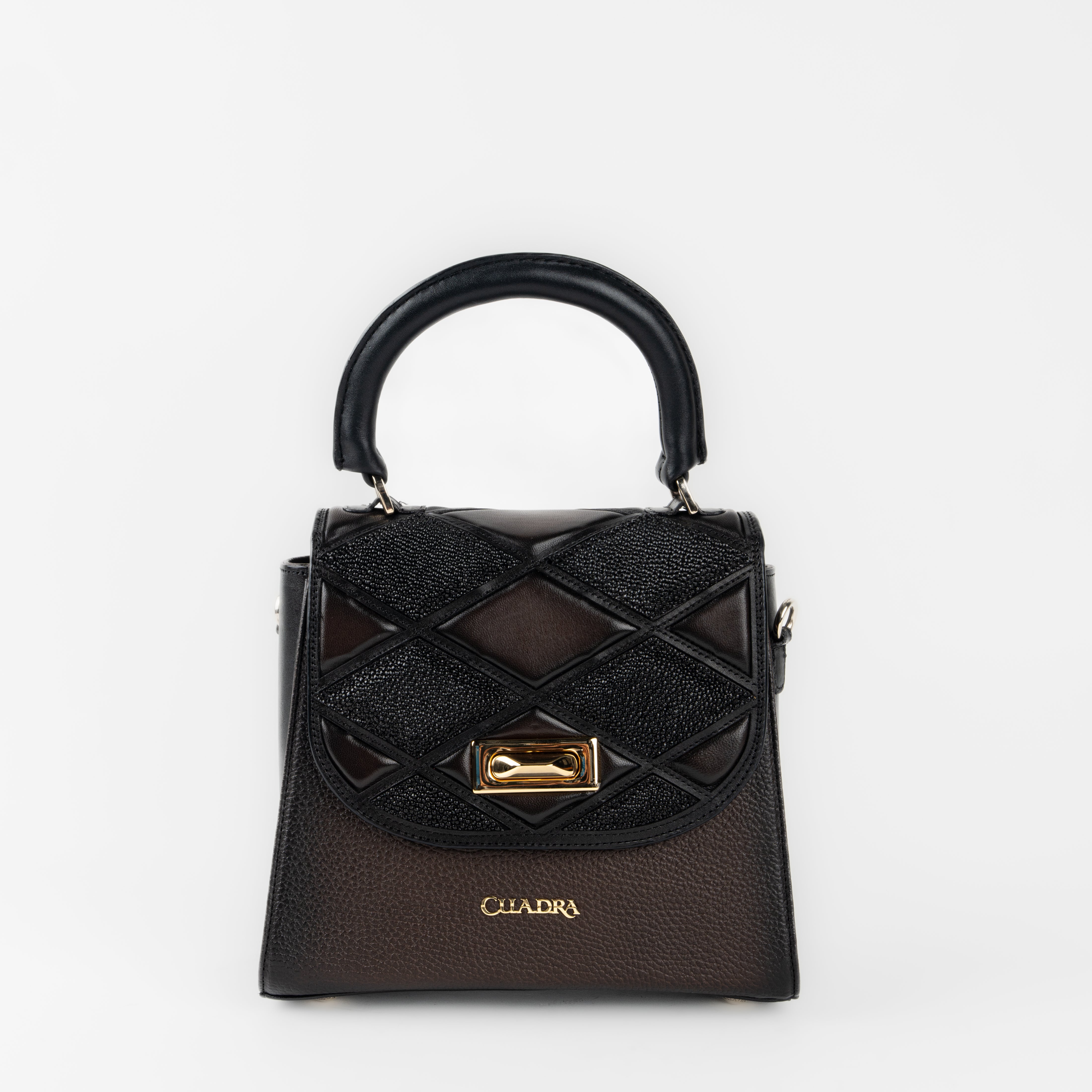 Bolso de mano en piel genuina de mantarraya y piel de bovino. Al frente presenta diseño capitonado en motivos geométricos y aplicación metálica del logotipo Cuadra. La parte interna presenta un compartimento con cuatro espacios para tarjetas. Incluye asa corta y asa larga ajustable y desmontable. Asegurada con broche metálico.