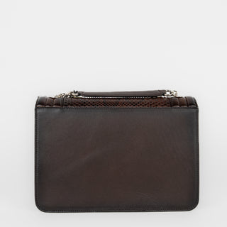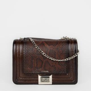 Bolso de hombro en piel genuina de pitón y piel de bovino para dama. Al frente presenta capitonado, aplicación metálica del logotipo Cuadra, y piel genuina de pitón. Con asa de cadena doble que puede alargase para usar como crossbody. La parte interna con un compartimento con cuatro tarjeteros y forro con grabado del logotipo. Asegurado con broche con aplicación de cristales.