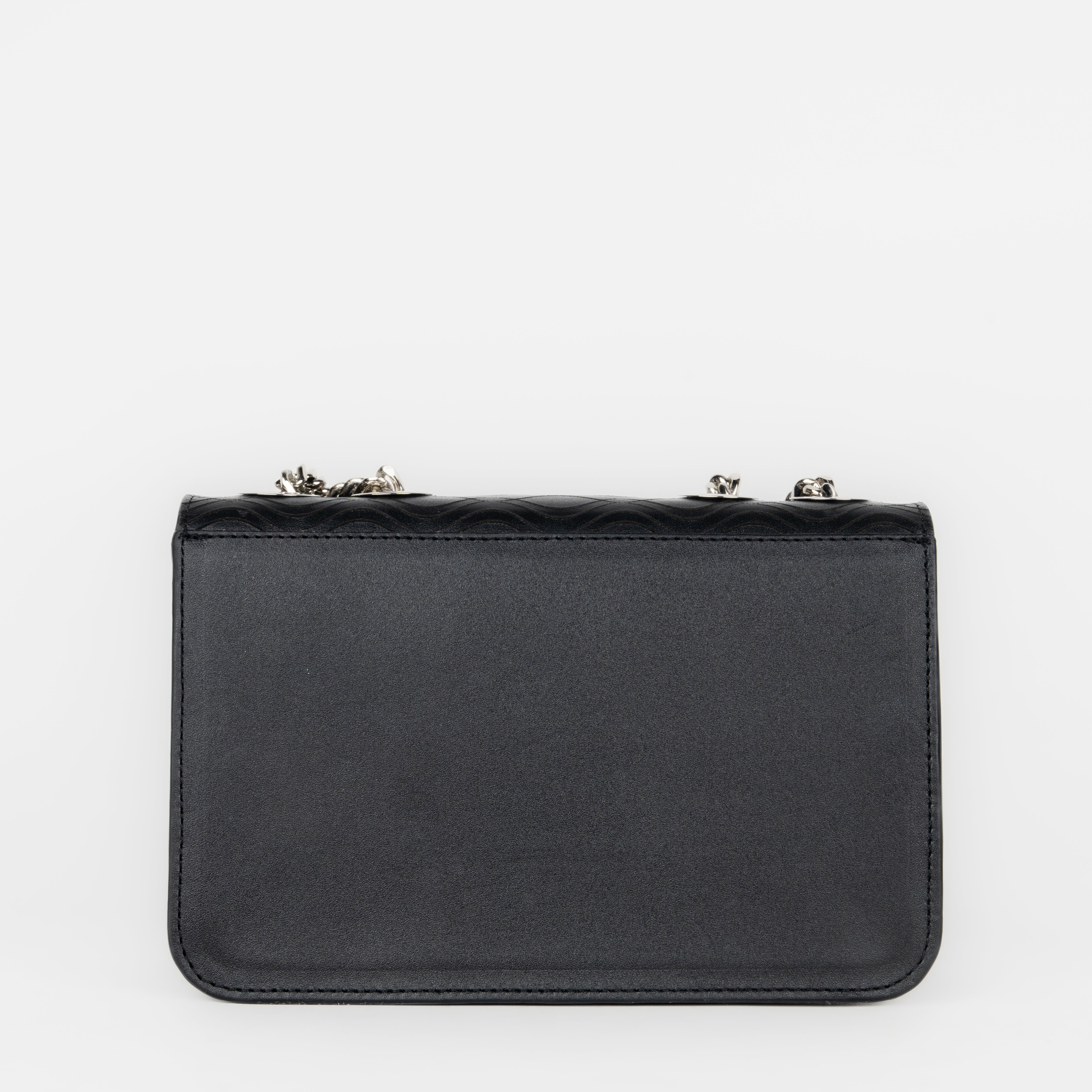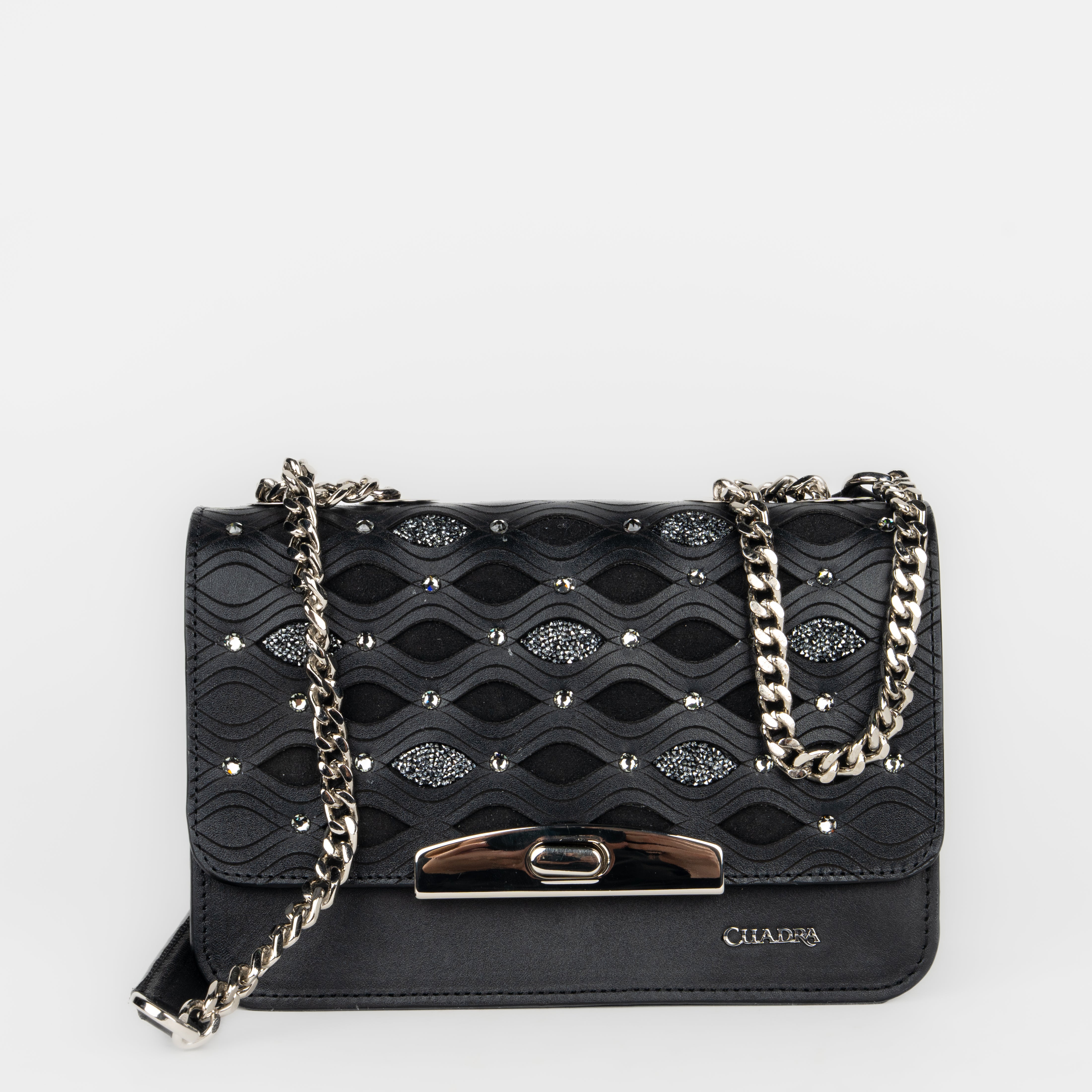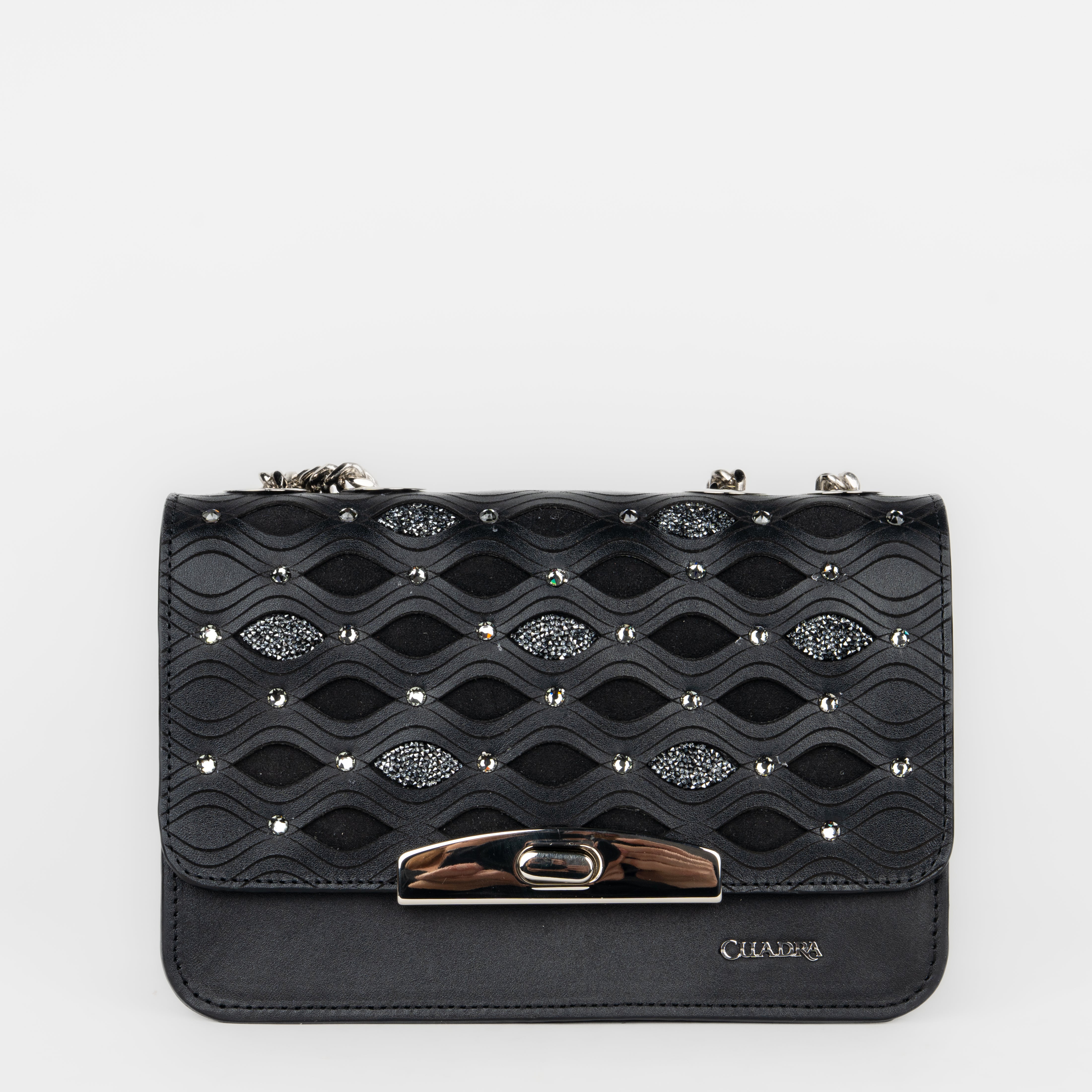 Bolso de hombro para dama en piel de bovino. Presenta grabado láser y aplicaciones de cristales auténticos swarovski. Con asa de cadena doble que puede alargase para usar como crossbody. Asegurado con broche.