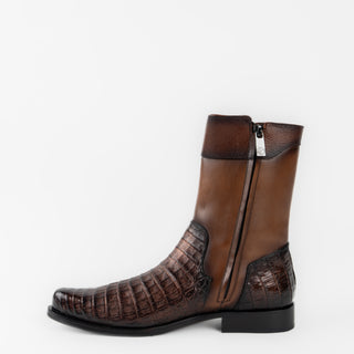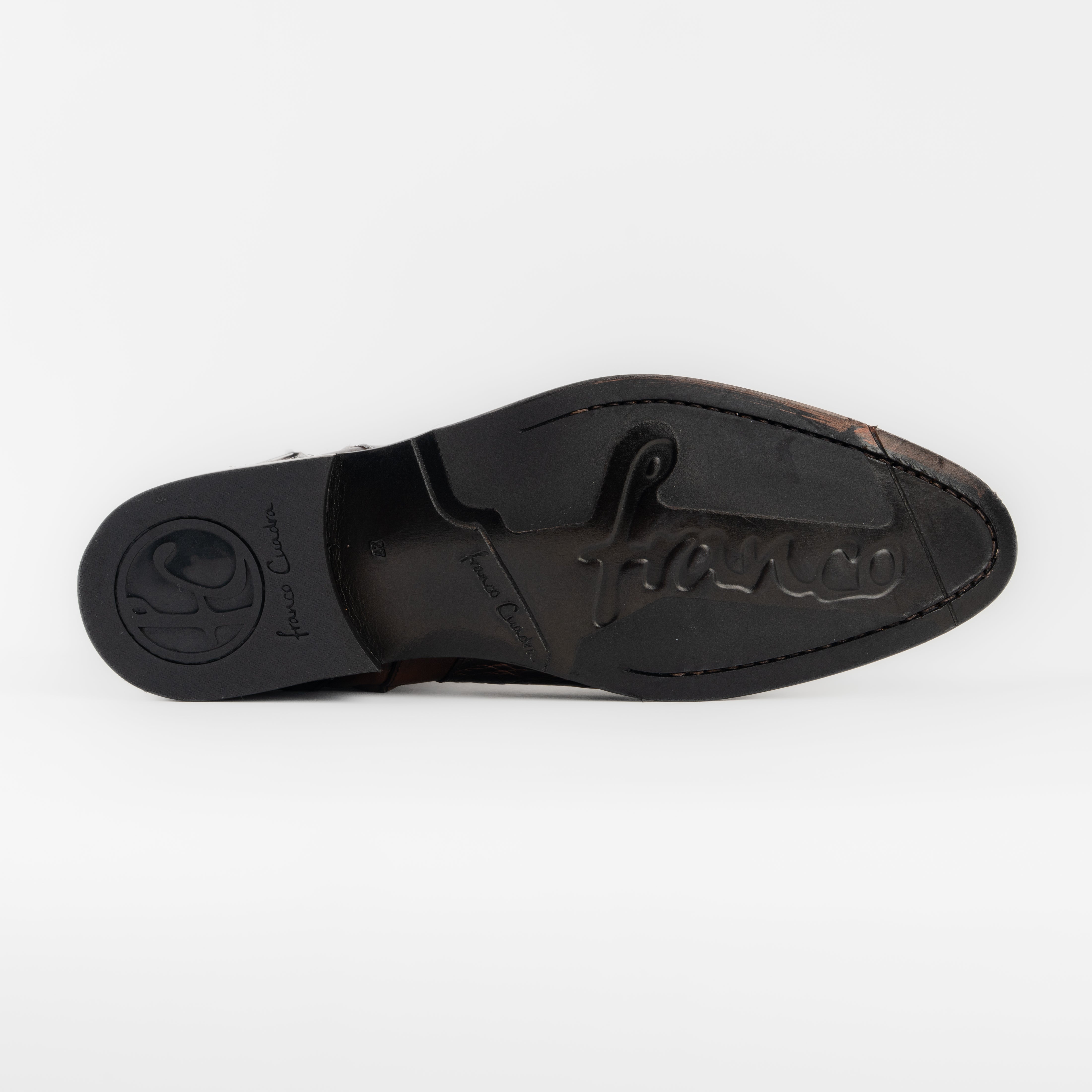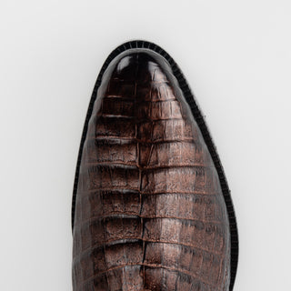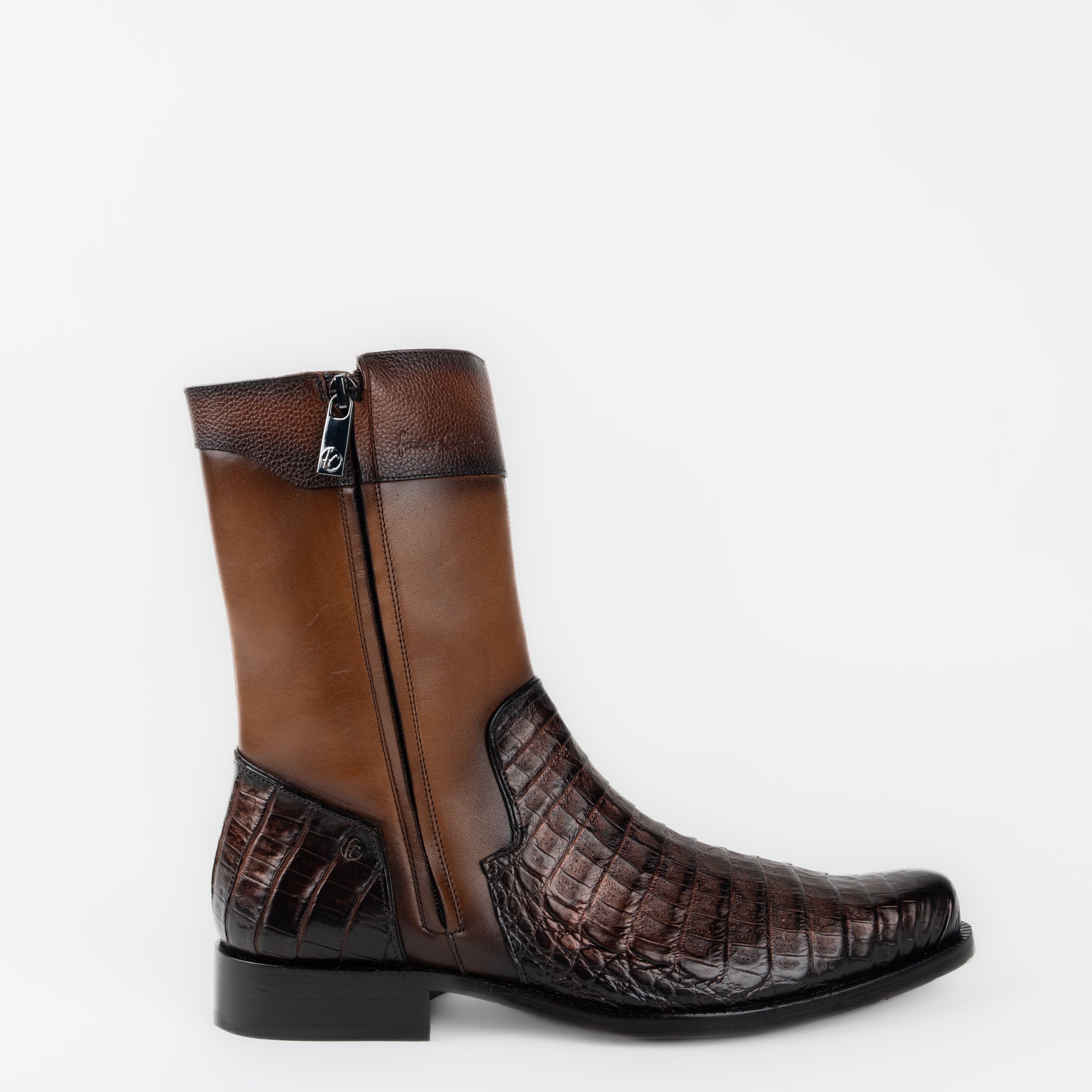 Bota de vestir para caballero en piel genuina de caimán y piel de bovino. Presenta grabado del logotipo Franco Cuadra y sombreado a mano. Ajustado con doble cierre a los costados. Con suela de cuero con injerto de TPU.