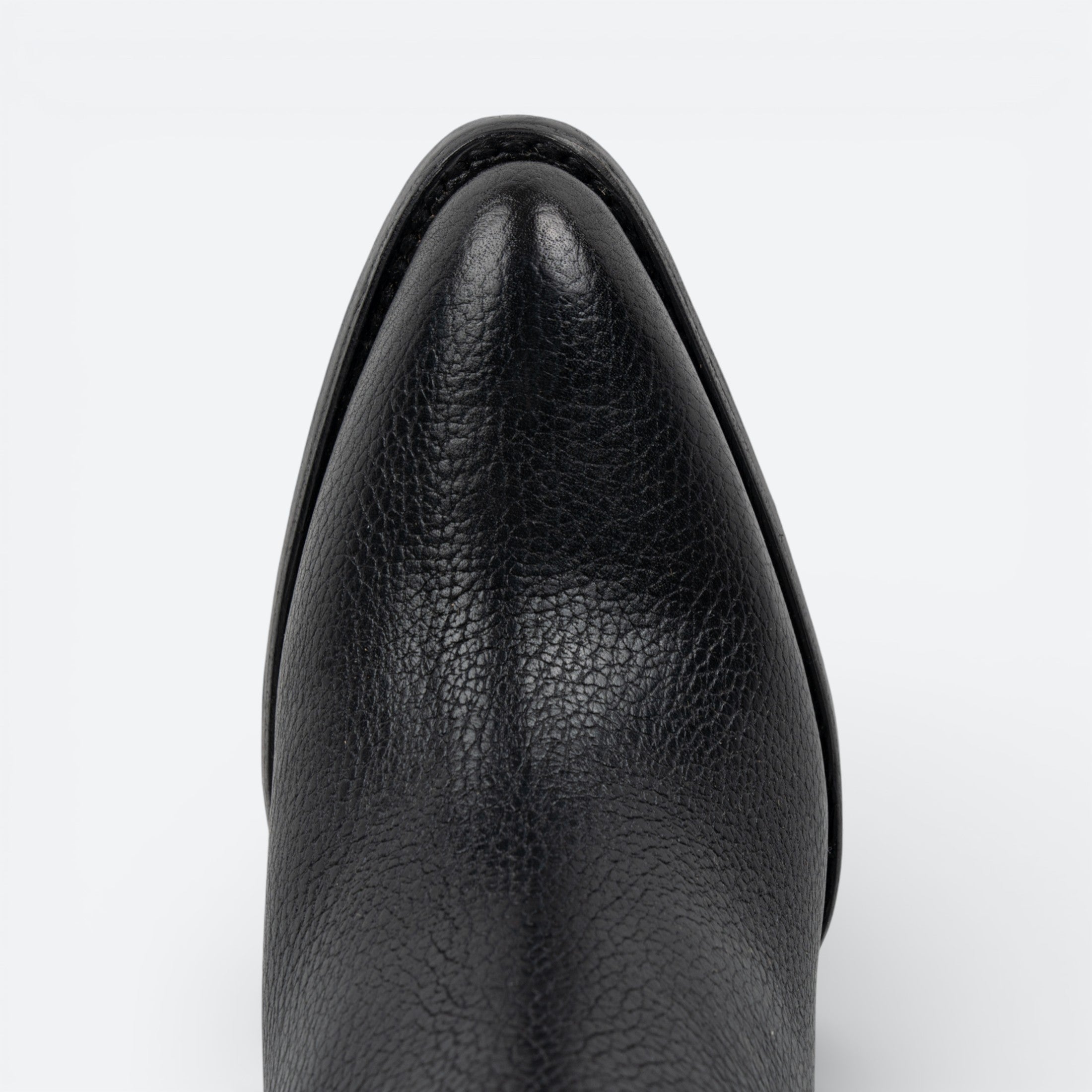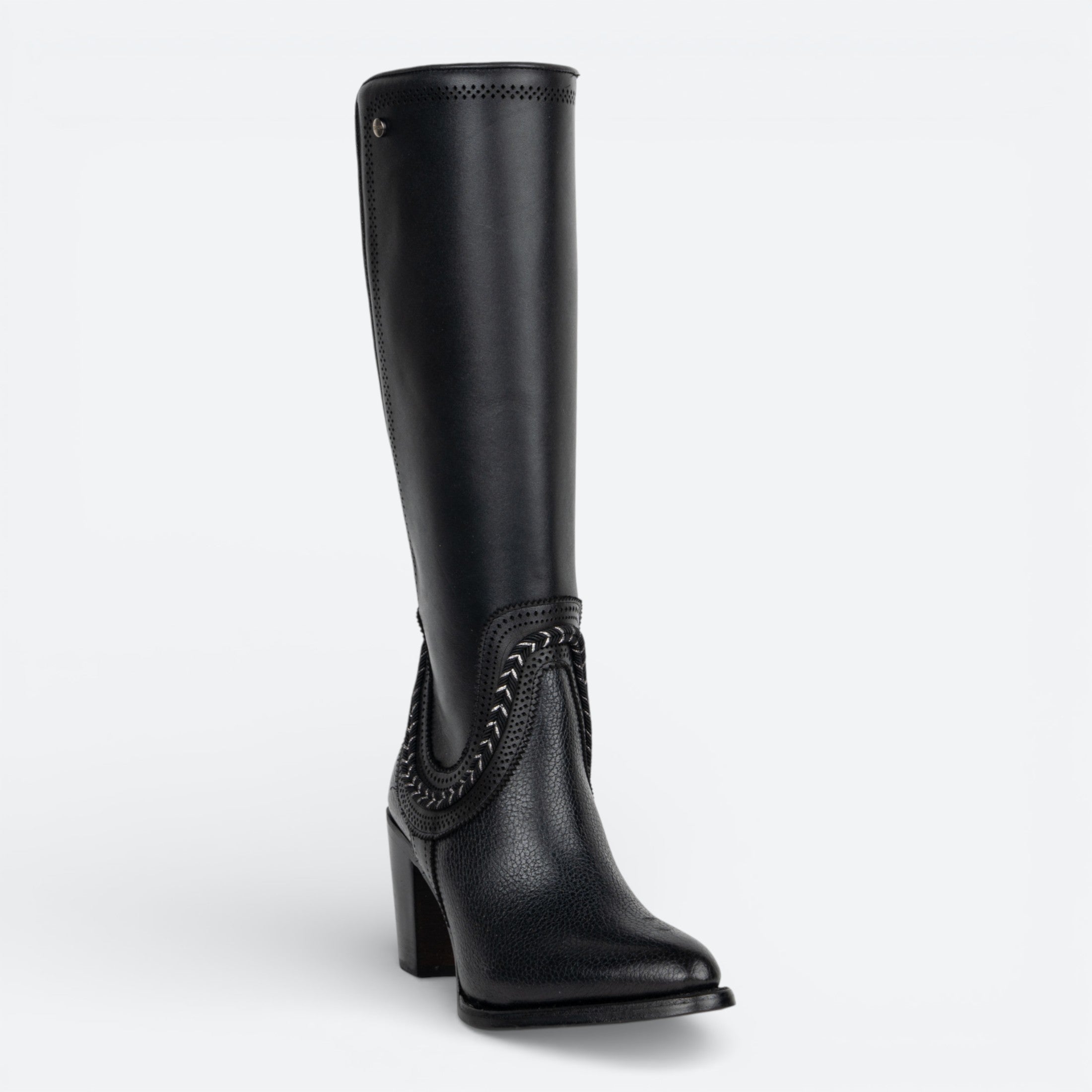 Bota alta casual para dama en piel genuina de bovino. Aplicación de piel genuina en el tubo con fino perforado y trenza de piel en contraste de textura y color. Con herraje personalizado con el logotipo de la marca. Ajustada con cierre interno. Suela de cuero con injerto de TPU.