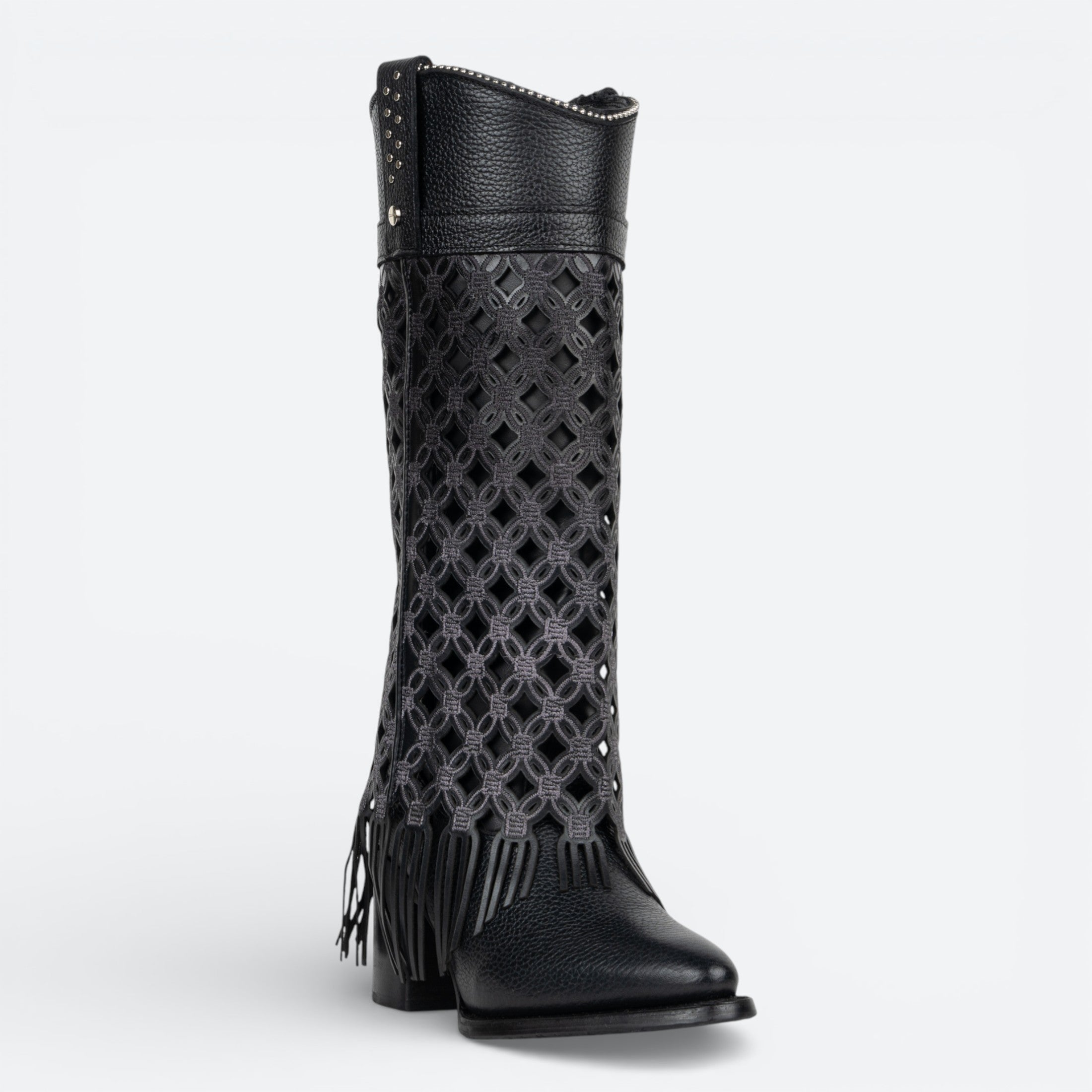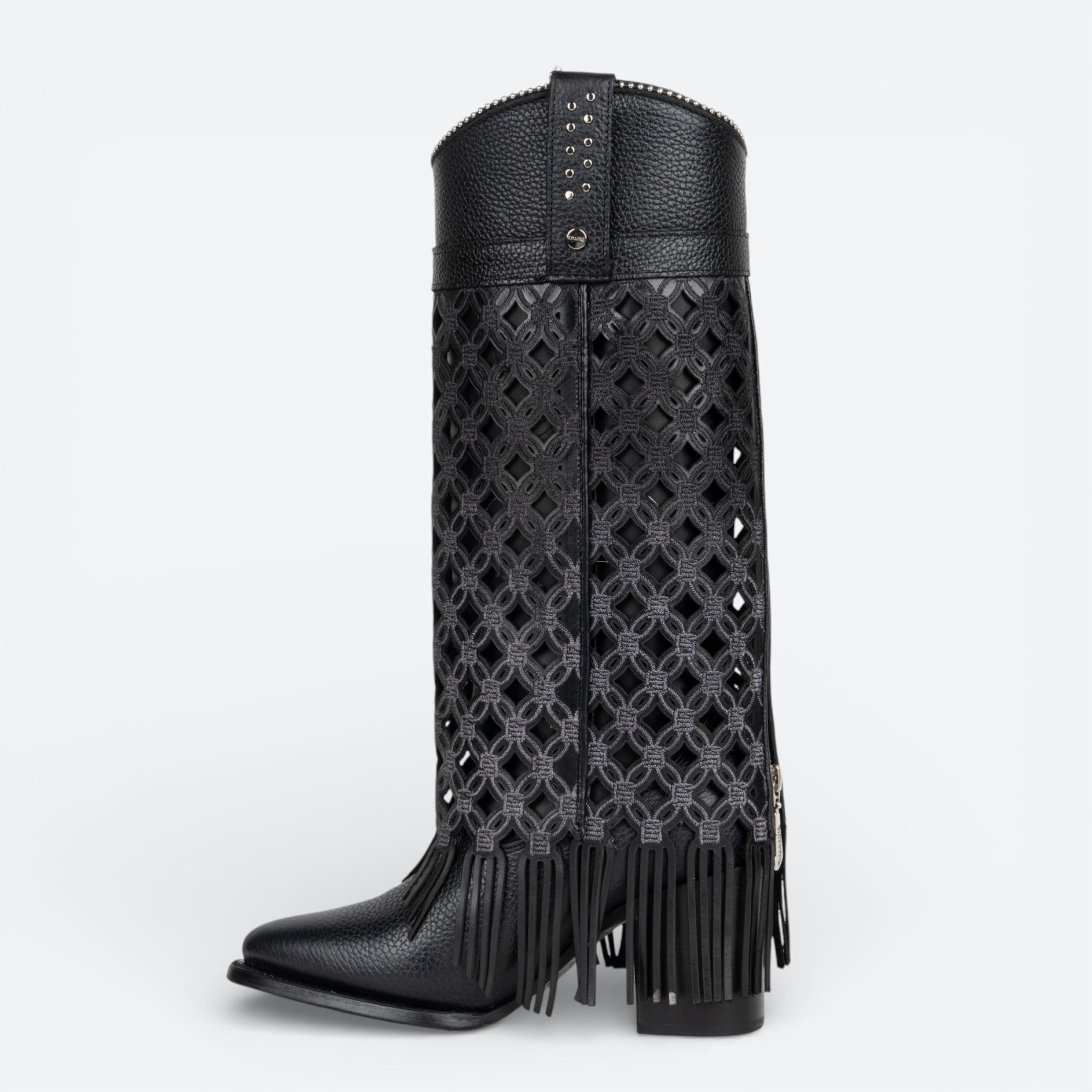 Bota Cuadra de piel auténtica con detalles de flecos que añaden un toque bohemio. Diseño clásico en negro que combina con cualquier outfit, desde casual hasta formal. Confeccionada con materiales de calidad superior para garantizar durabilidad y comodidad en cada paso. Los flecos característicos le dan movimiento y personalidad a tu look.