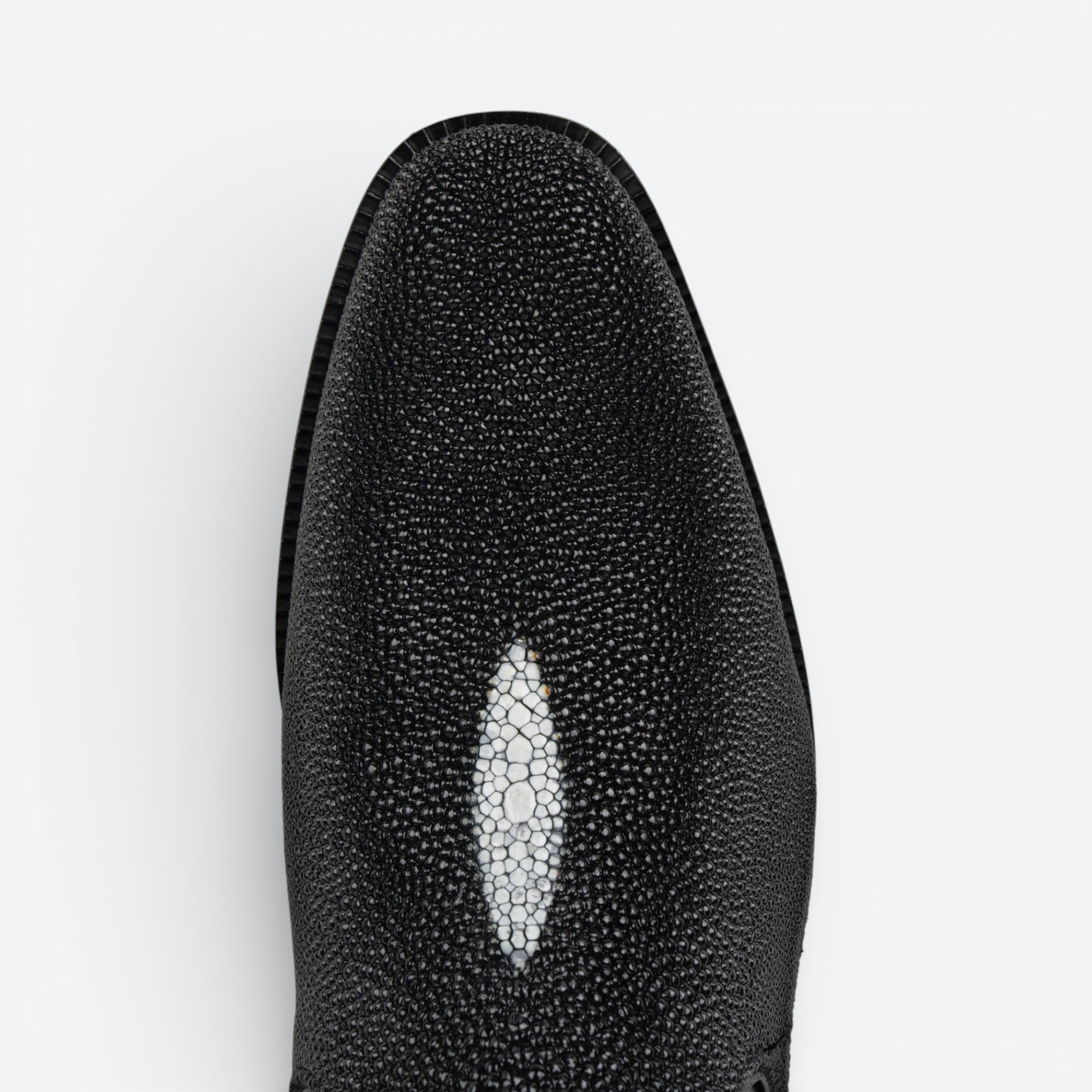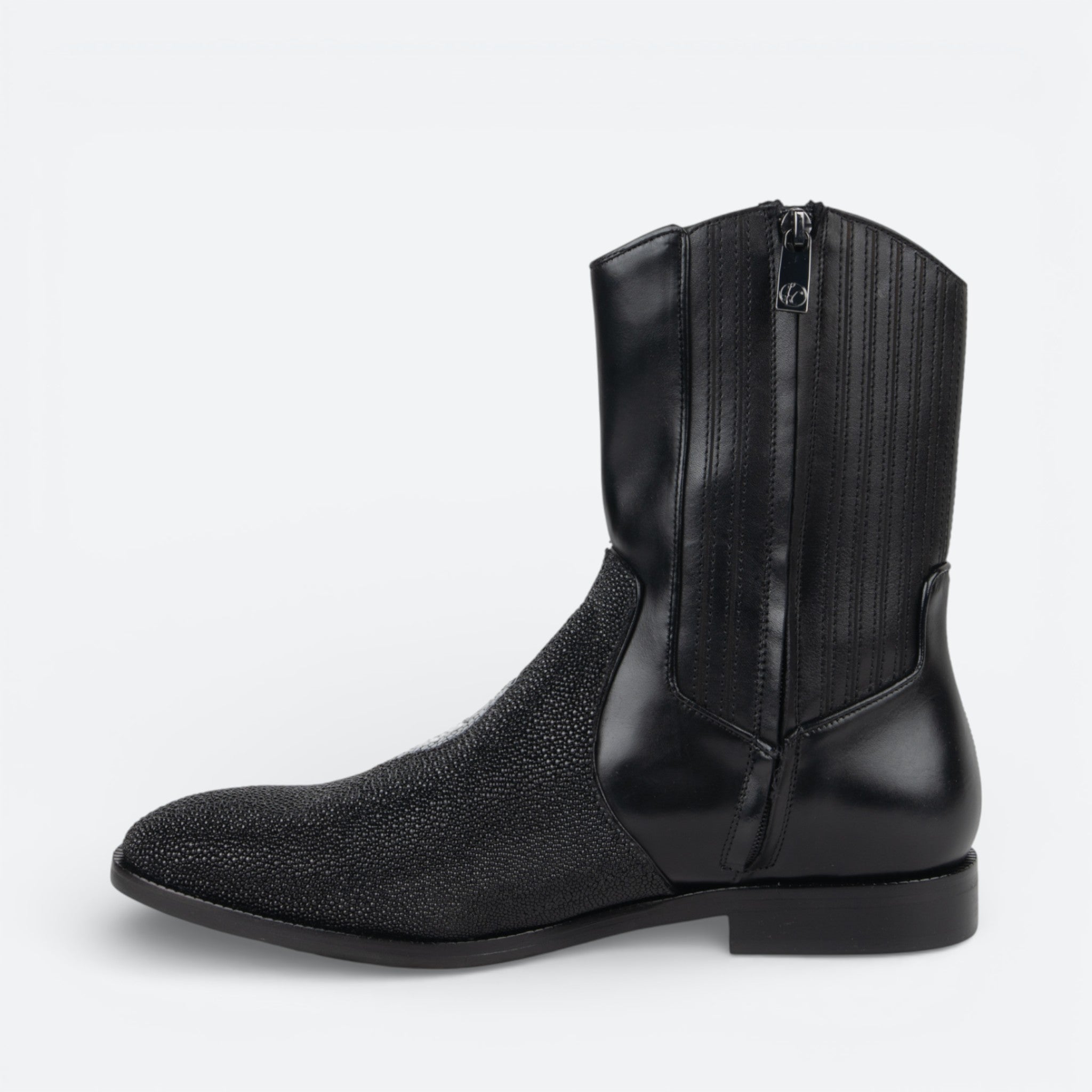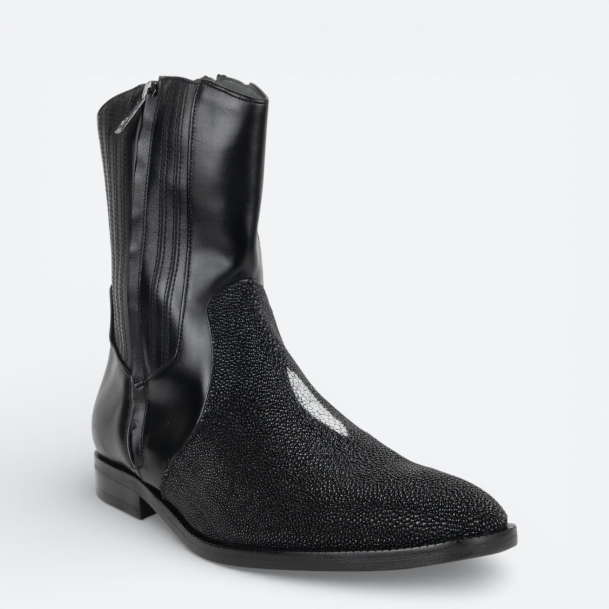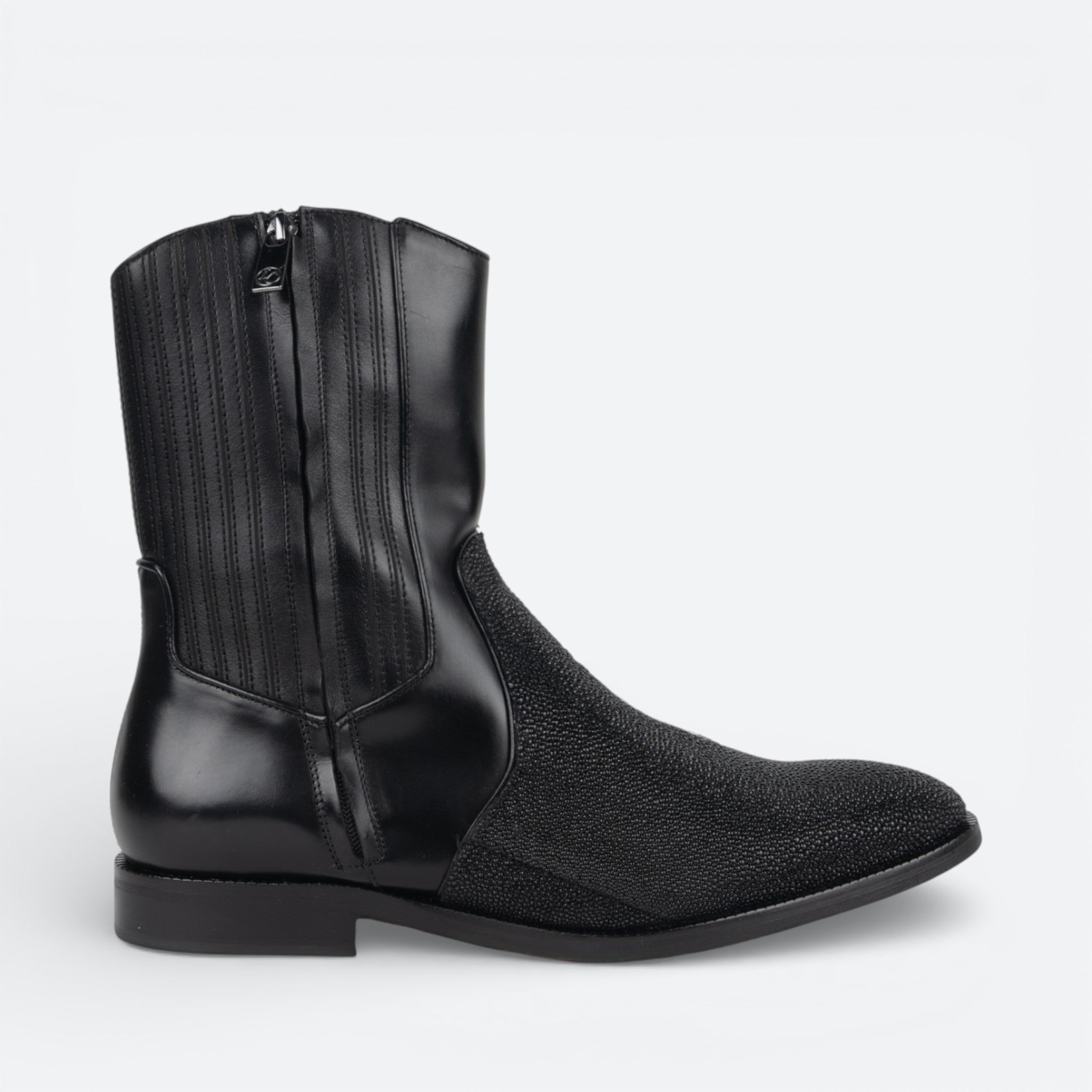 Bota de vestir para caballero en piel genuina de mantarraya y piel de bovino. Presenta ajuste de doble cierre a los costados. Con suela de cuero con injerto de TPU.
