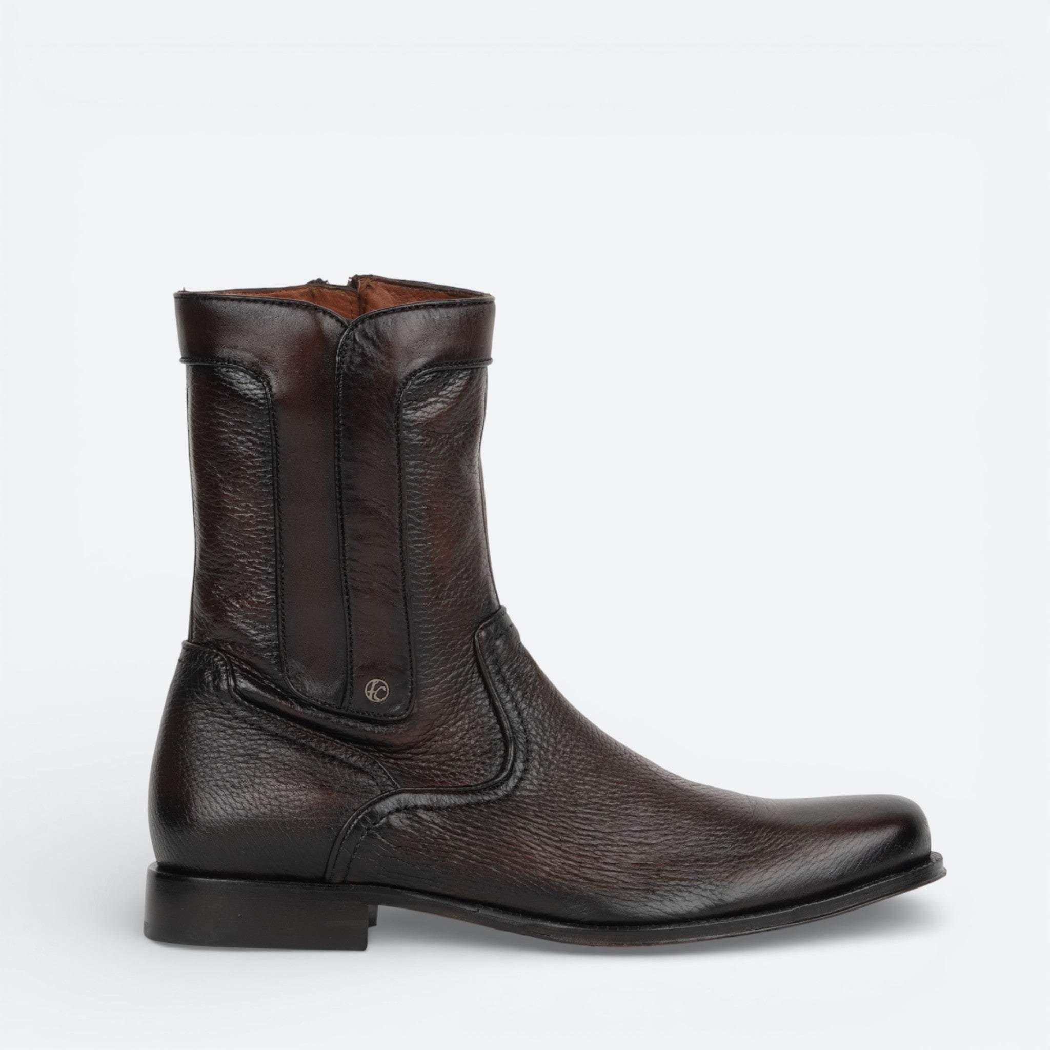 Botín de vestir para caballero en piel genuina de venado. Presenta sutil grabado de monograma Franco cuadra al costado. Ajuste mediante cierre interno. Suela de cuero con injerto de TPU.