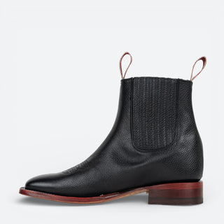 Botín de piel auténtica con suela de cuero resistente, diseñado para caballero. Su construcción de calidad garantiza un calzado versátil que combina elegancia con funcionalidad. Perfecto para ocasiones casuales y formales, este botín negro es una inversión en estilo.