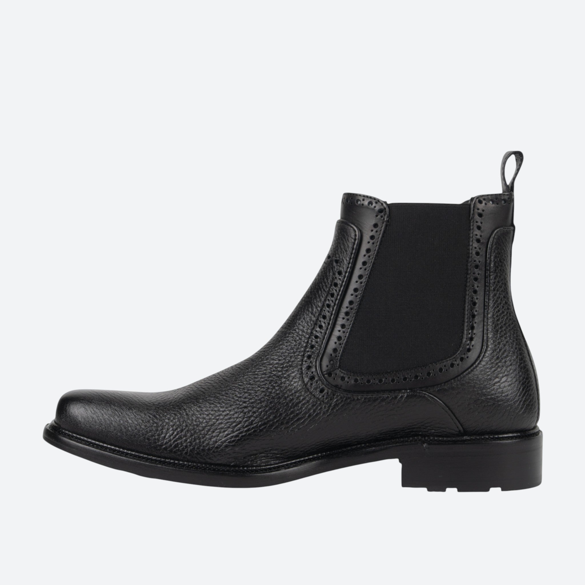 Botín para caballero en piel genuina de venado. Presenta elástico en tubo, así como perforaciones a modo decorativo. Color negro.