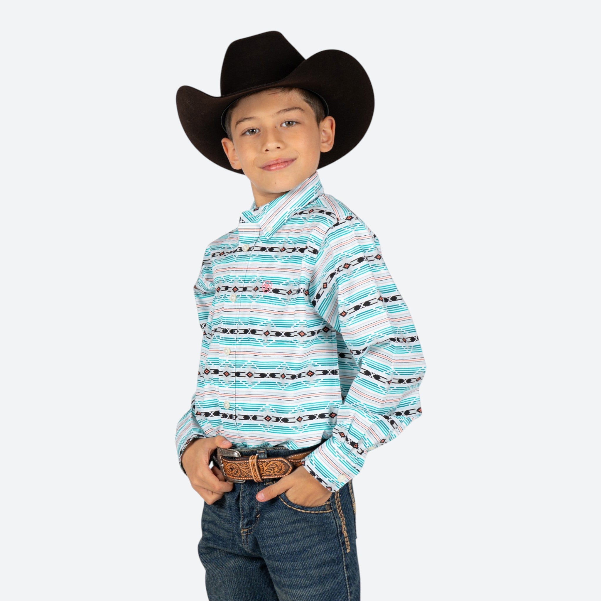 Camisa vaquera infantil Ariat con diseño Aztec, perfecta para el pequeño vaquero. Confeccionada con tela de algodón resistente y cómoda, ideal para días de trabajo en el rancho o eventos especiales.