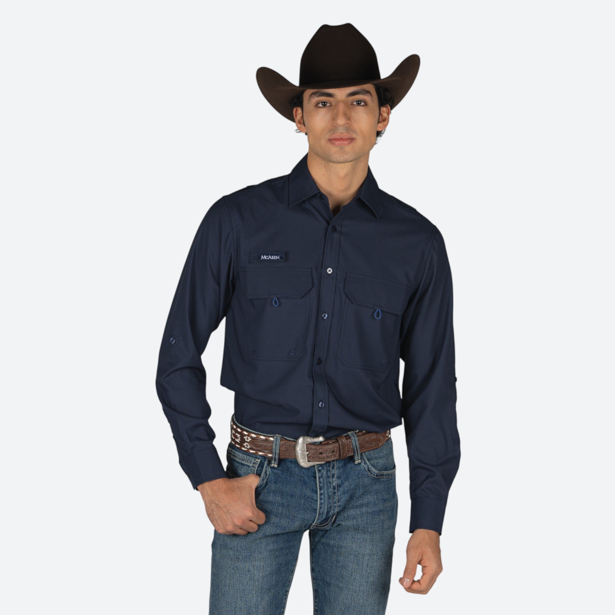 Camisa McAllen modelo Coral en marino para caballero, elaborada en tela súper fresca que garantiza comodidad durante todo el día.