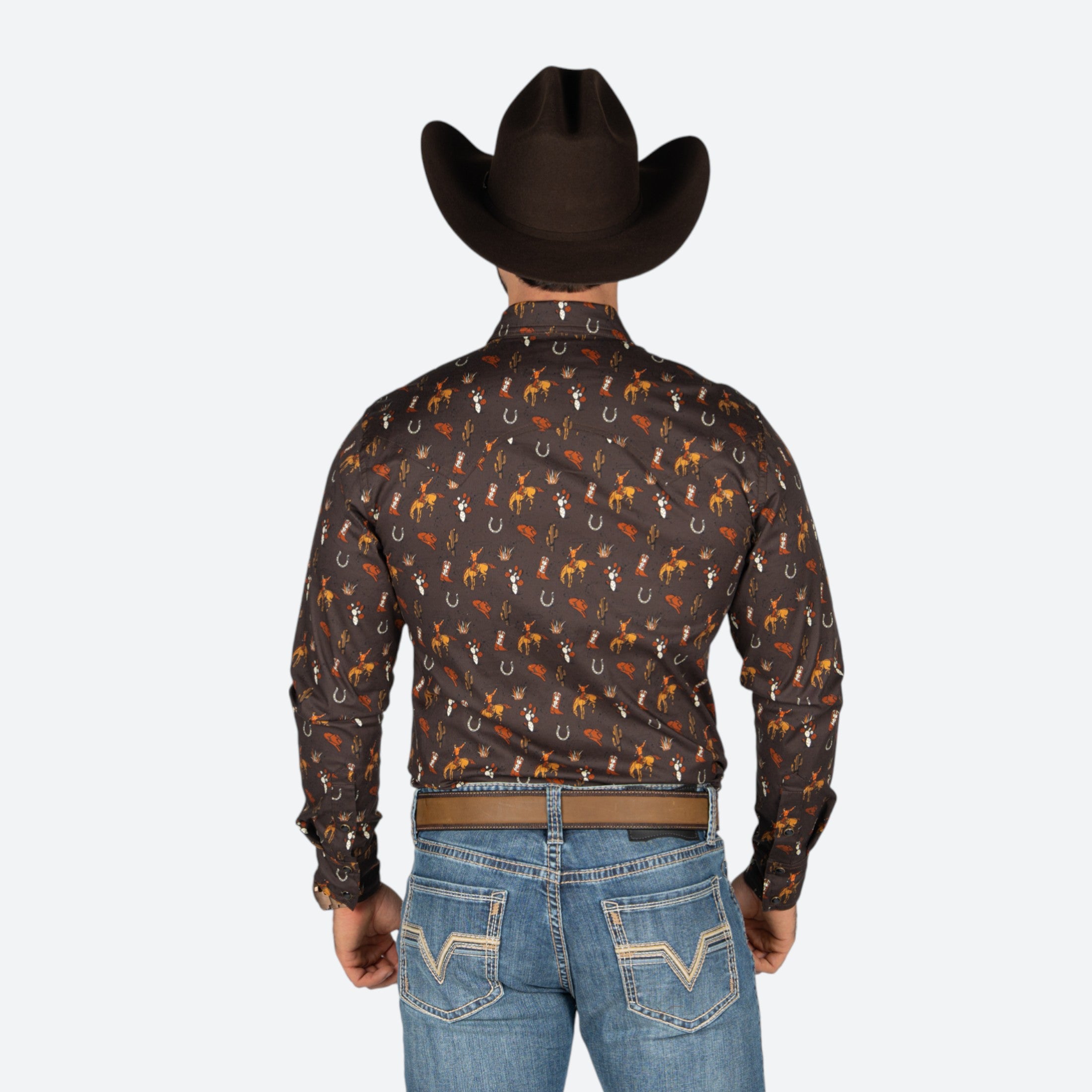 Camisa confeccionada en tela de calidad superior con un distintivo estampado que combina botas y herraduras, elementos icónicos del estilo western.