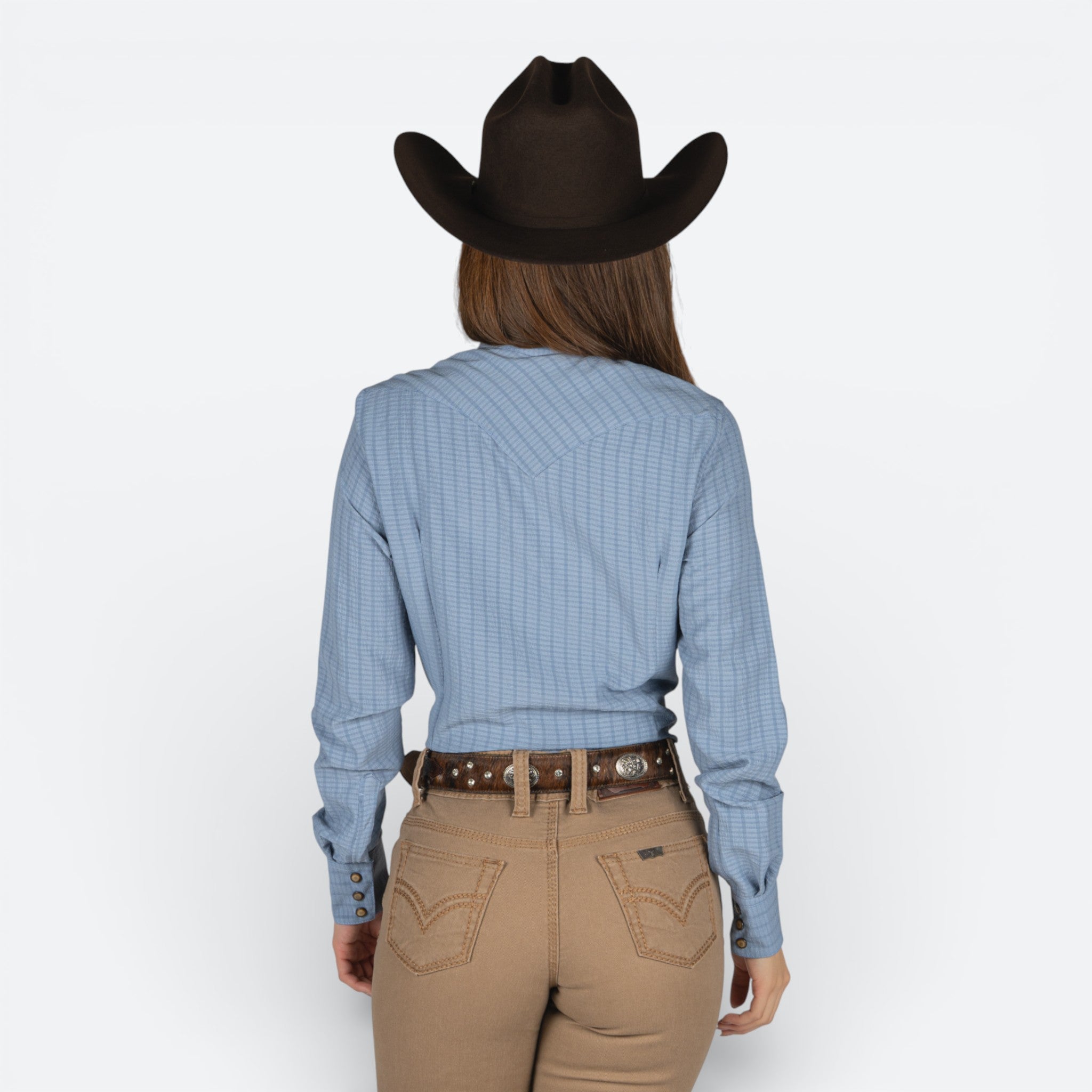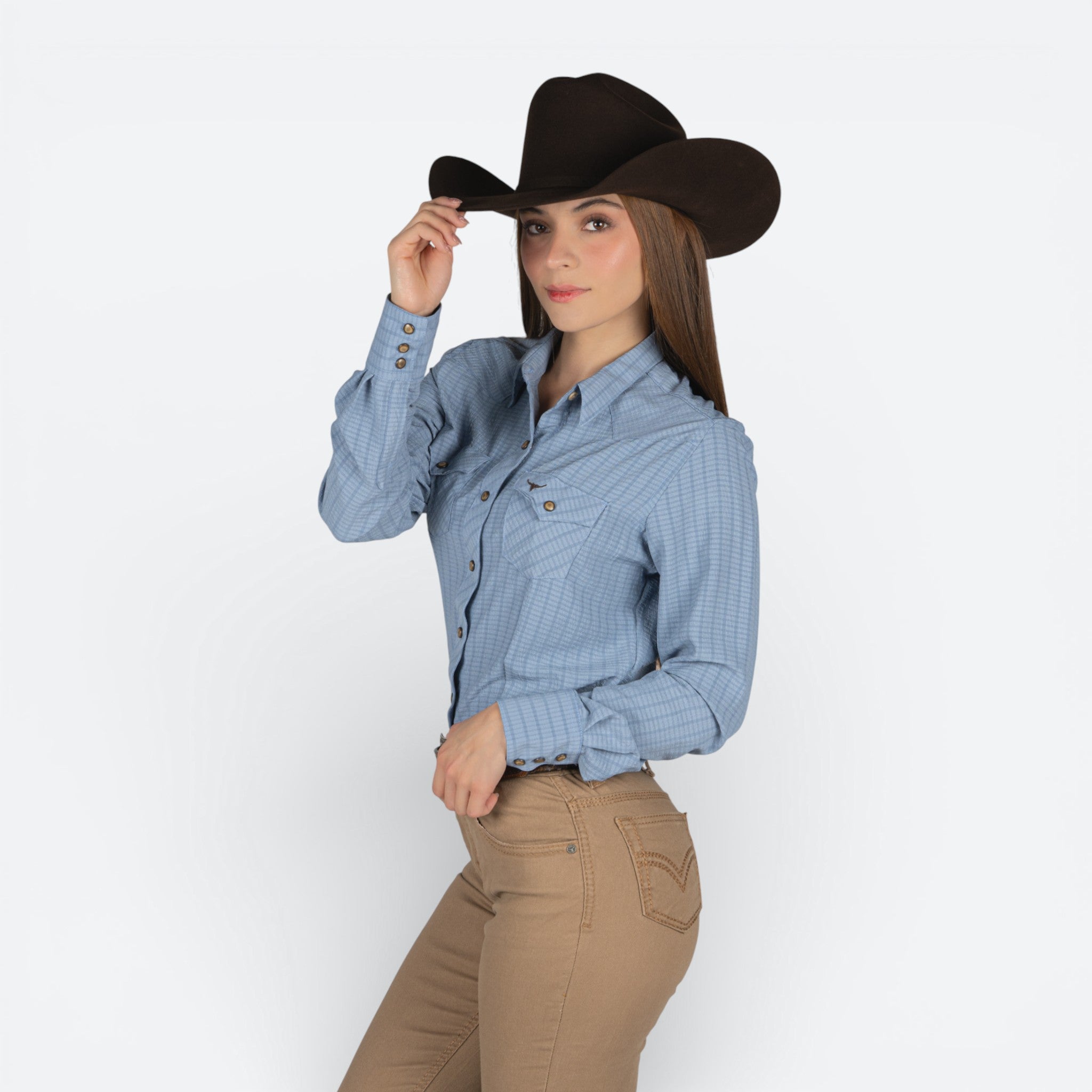 Camisa de rodeo confeccionada en tela de algodón de alta calidad, diseñada específicamente para damas. Su color celeste clásico combina con cualquier atuendo vaquero tradicional.