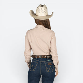 Camisa de rodeo confeccionada en tela kaki de alta calidad, diseñada específicamente para mujeres que buscan comodidad y estilo auténtico. Cuenta con corte ajustado que favorece la silueta, botones de presión funcionales y detalles clásicos del western.