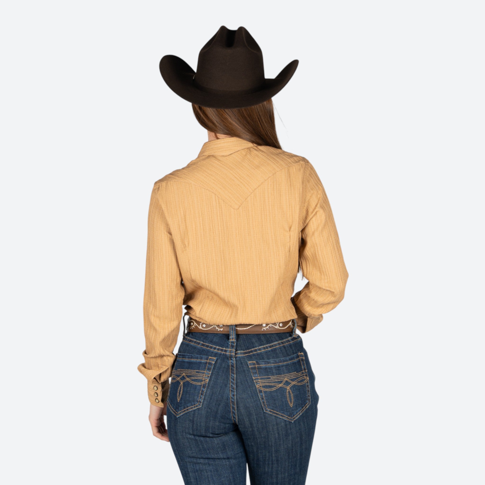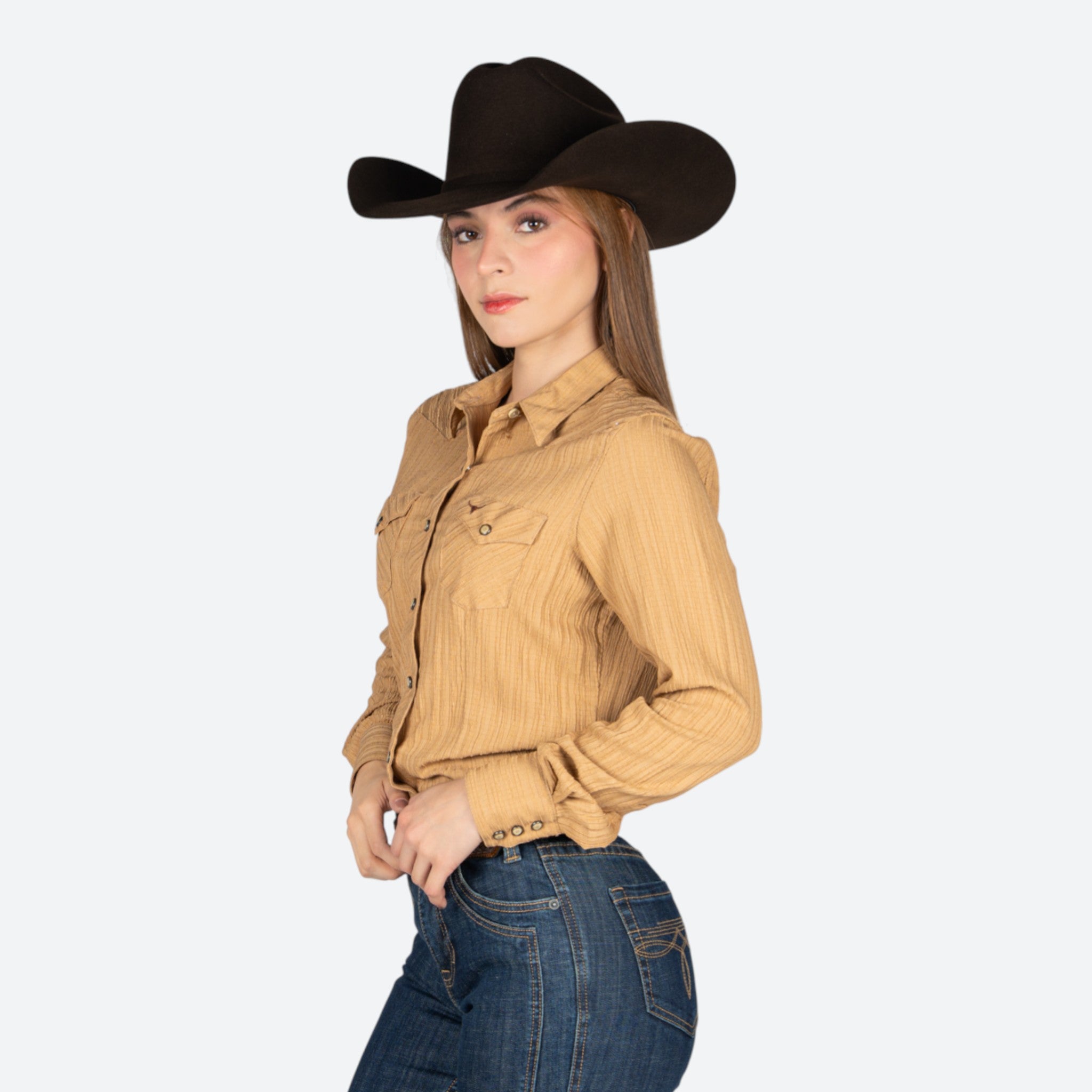Camisa de rodeo confeccionada en tela resistente de alta calidad, diseñada específicamente para dama. Presenta un corte clásico que combina comodidad y estilo auténtico. El color marrón neutral se adapta a cualquier atuendo de rodeo o casual.