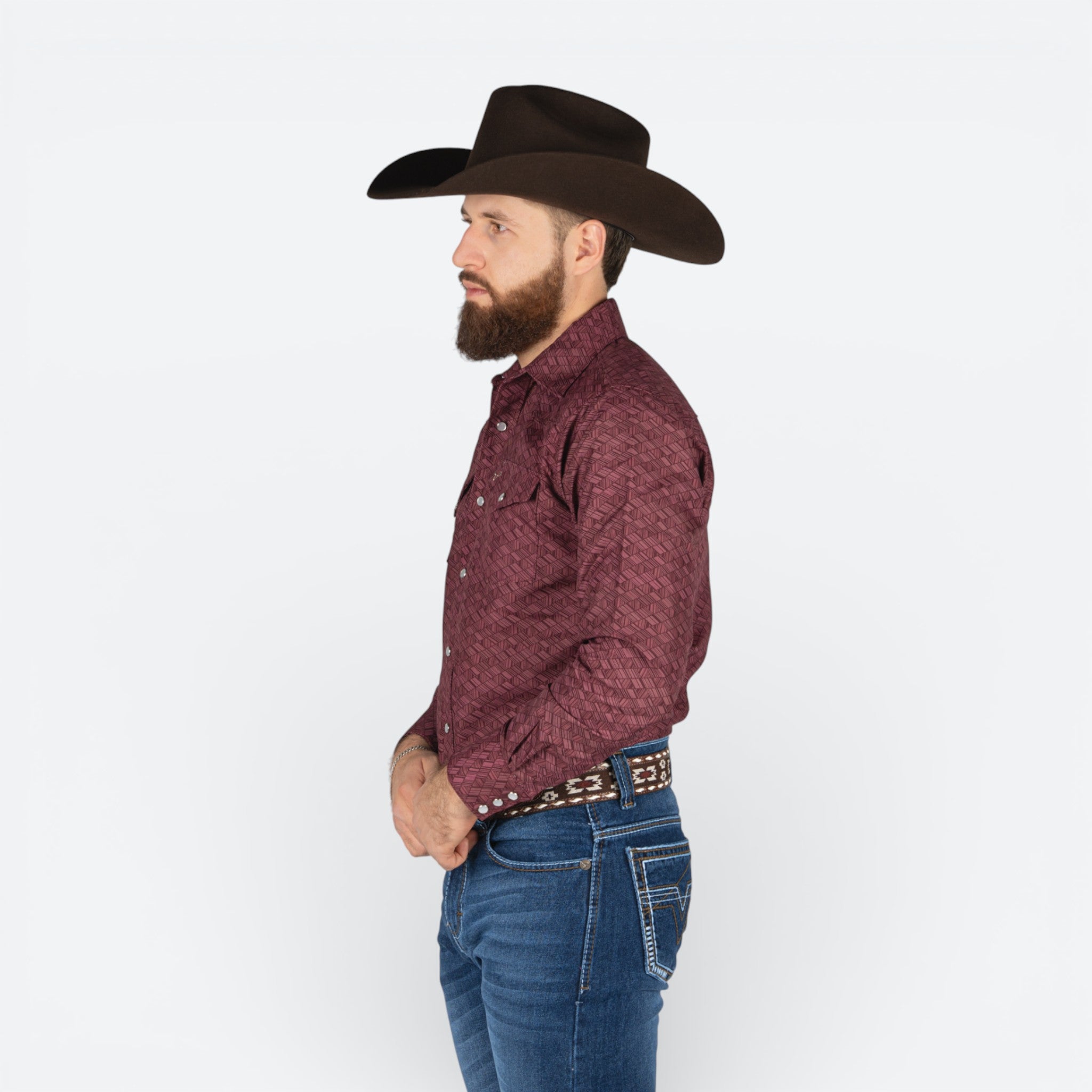 Camisa Rodeo Rombo en tonalidad vino, diseñada específicamente para el caballero. El color vino proporciona versatilidad, permitiéndote transitar desde ocasiones casuales hasta eventos más formales.