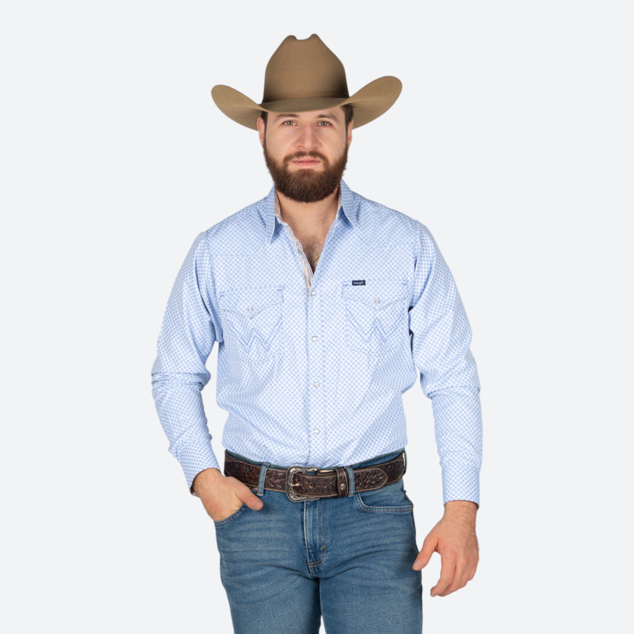 Camisa Wrangler de corte clásico en azul con estampado distintivo, diseñada para caballero. Confeccionada con materiales de calidad superior que garantizan durabilidad y comodidad en el uso diario.