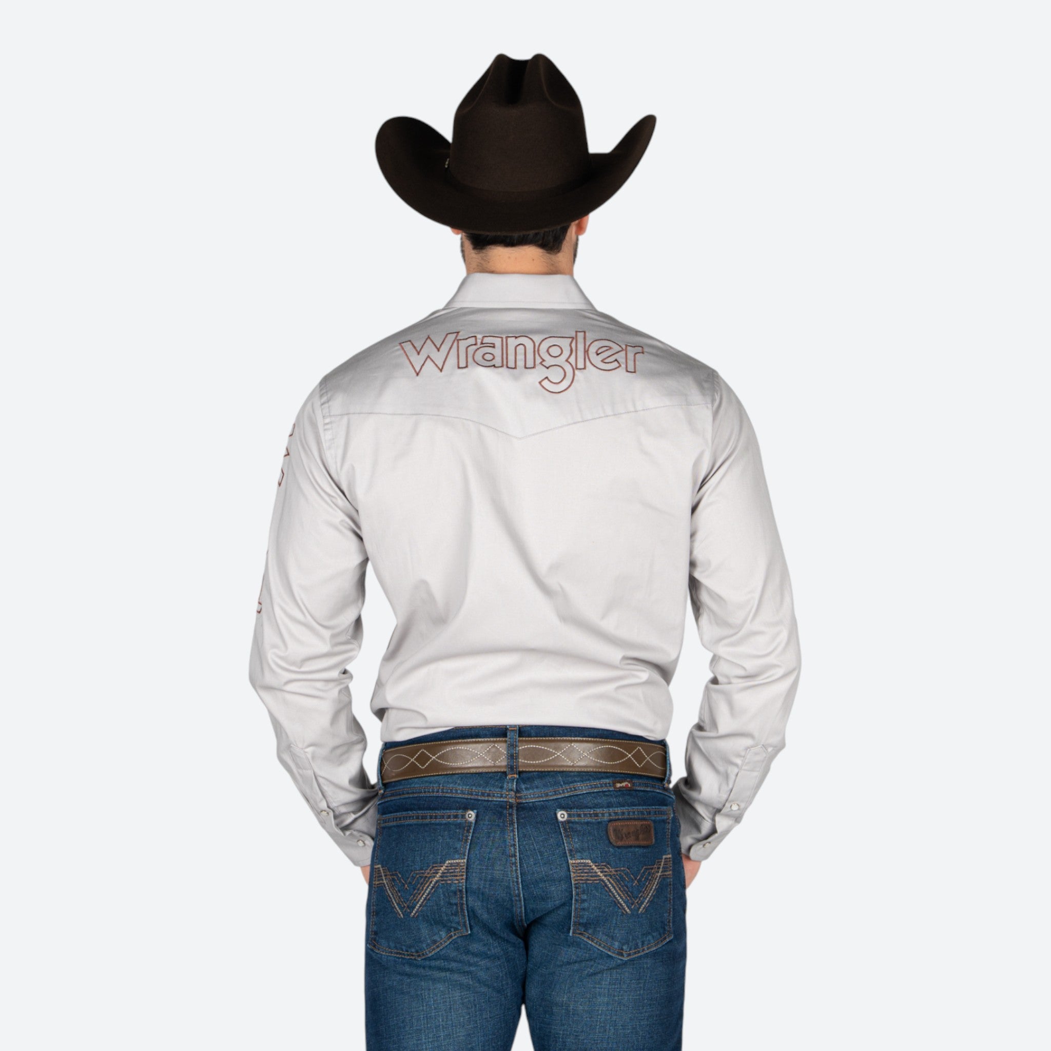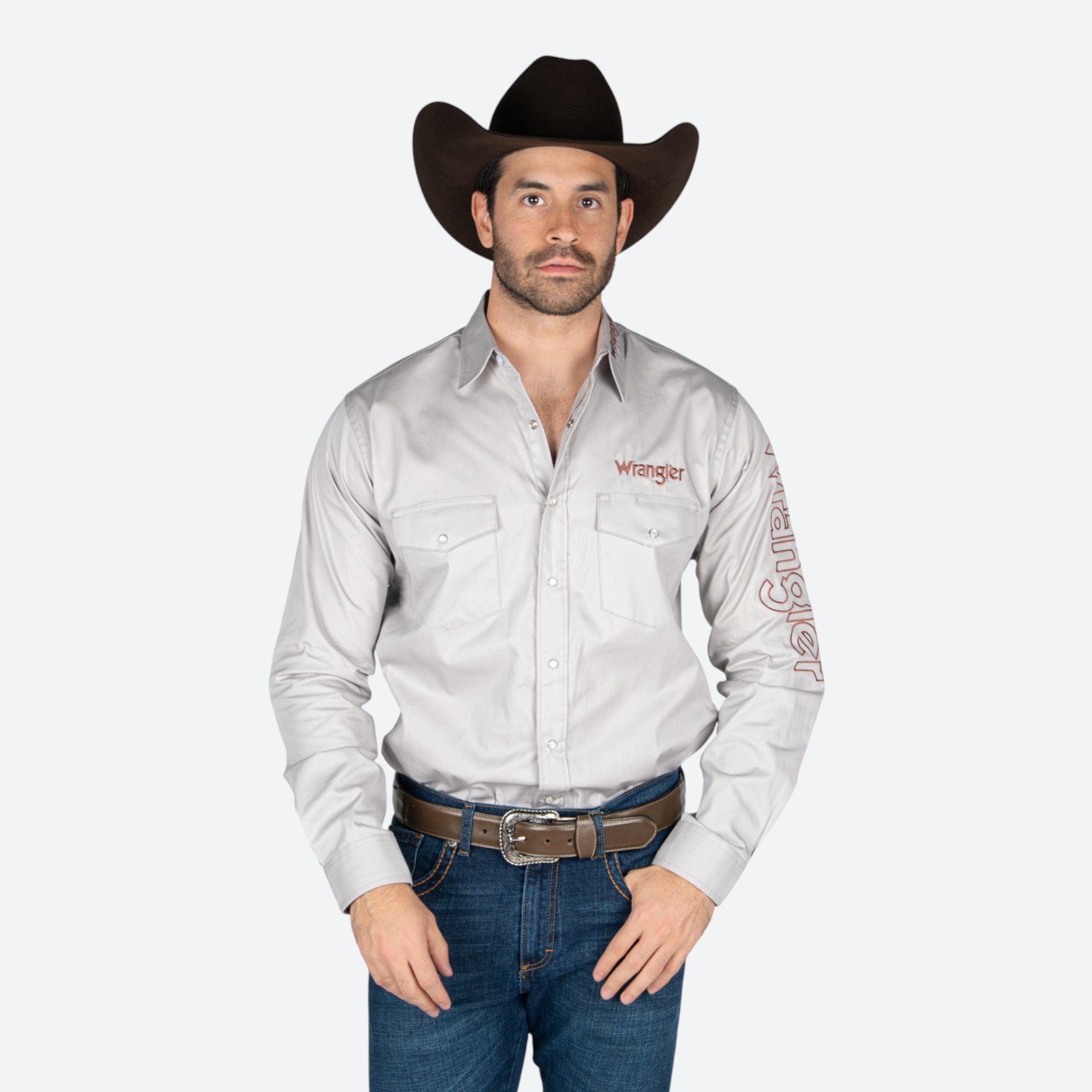 Camisa Wrangler de corte clásico para caballero en tono gris, confeccionada con los estándares de calidad que caracterizan a esta marca. Destaca por el distintivo logo de Wrangler bordado en la manga, un detalle que garantiza autenticidad y estilo.
