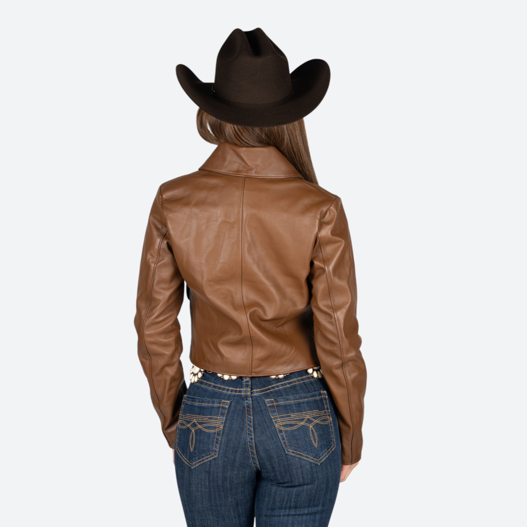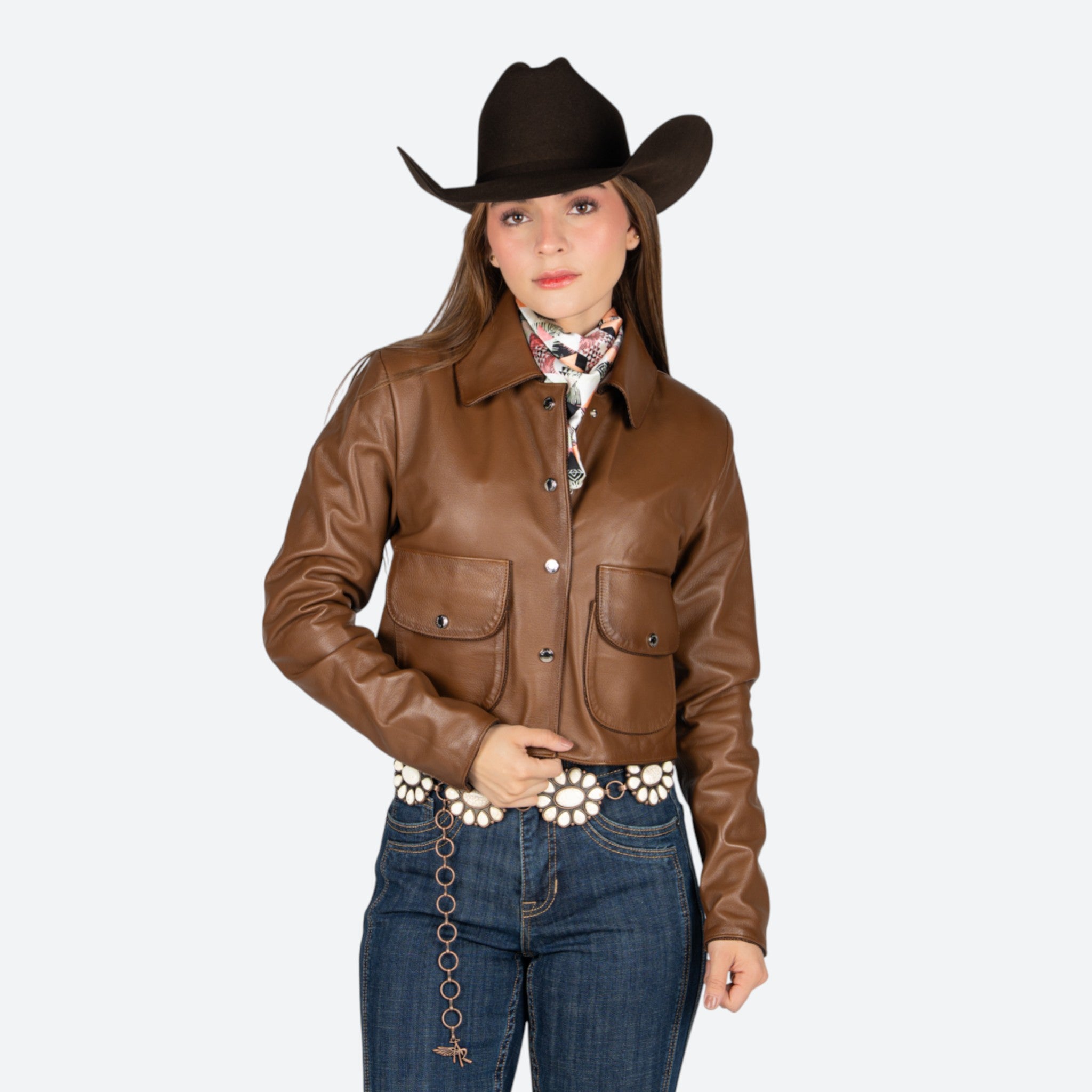 Chamarra para dama en piel genuina de ovino ultrasuave. Presenta dos bolsillos frontales asegurados con broches de presión con logotipo de Cuadra. Ajuste frontal con broches de presión. Con forro ligero.