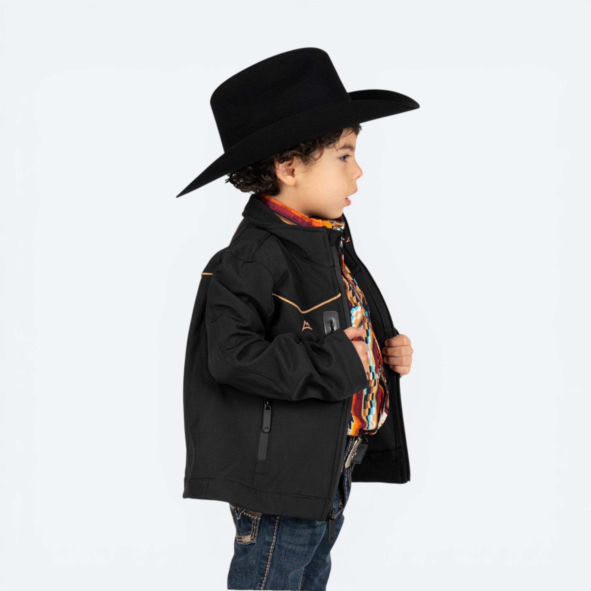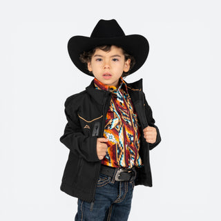 Chamarra vaquera clásica para niño en tonos oscuros. Confeccionada con tela resistente y duradera, perfecta para el uso diario.