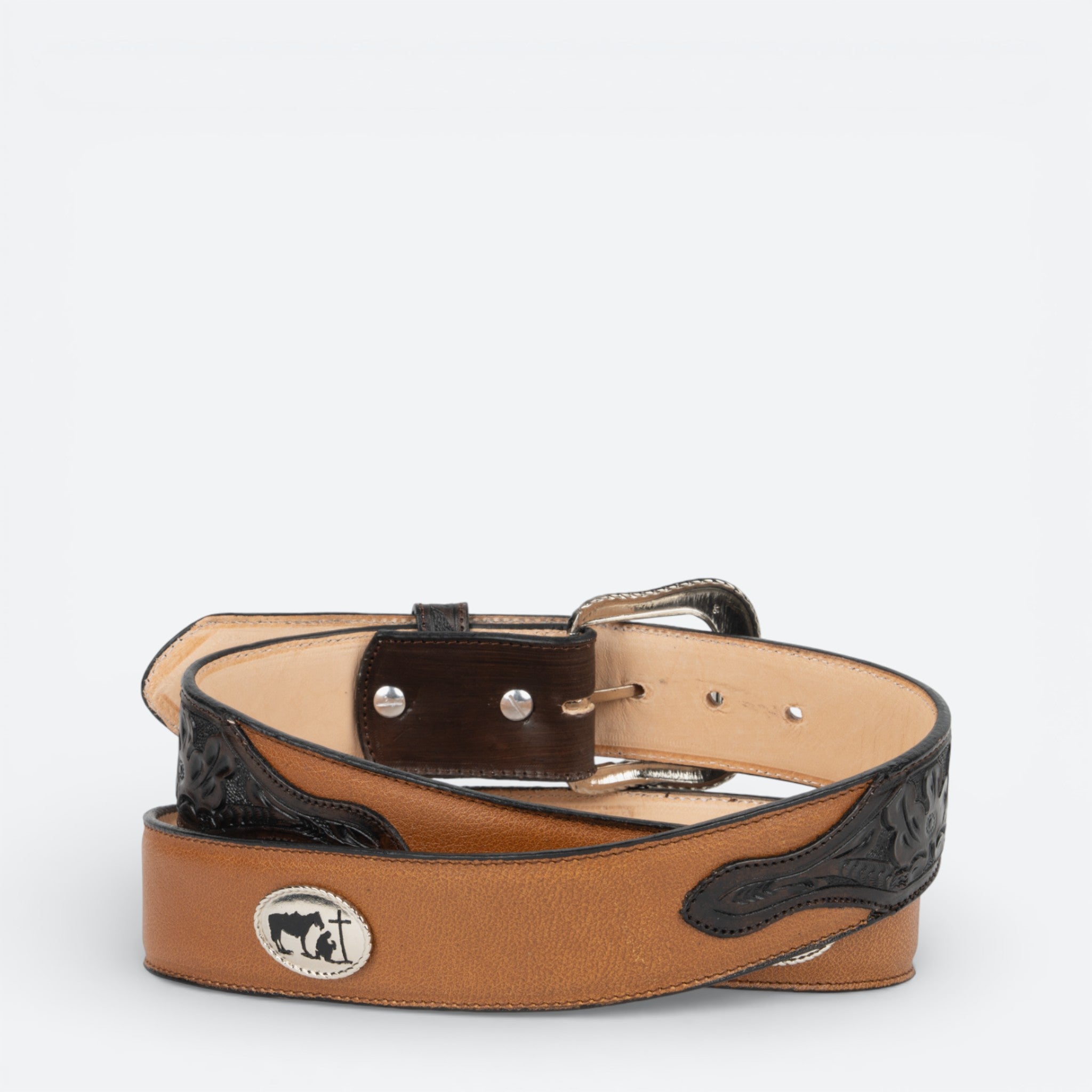 Cinturón de cuero auténtico con concho central que presenta la icónica "Oración del Vaquero"