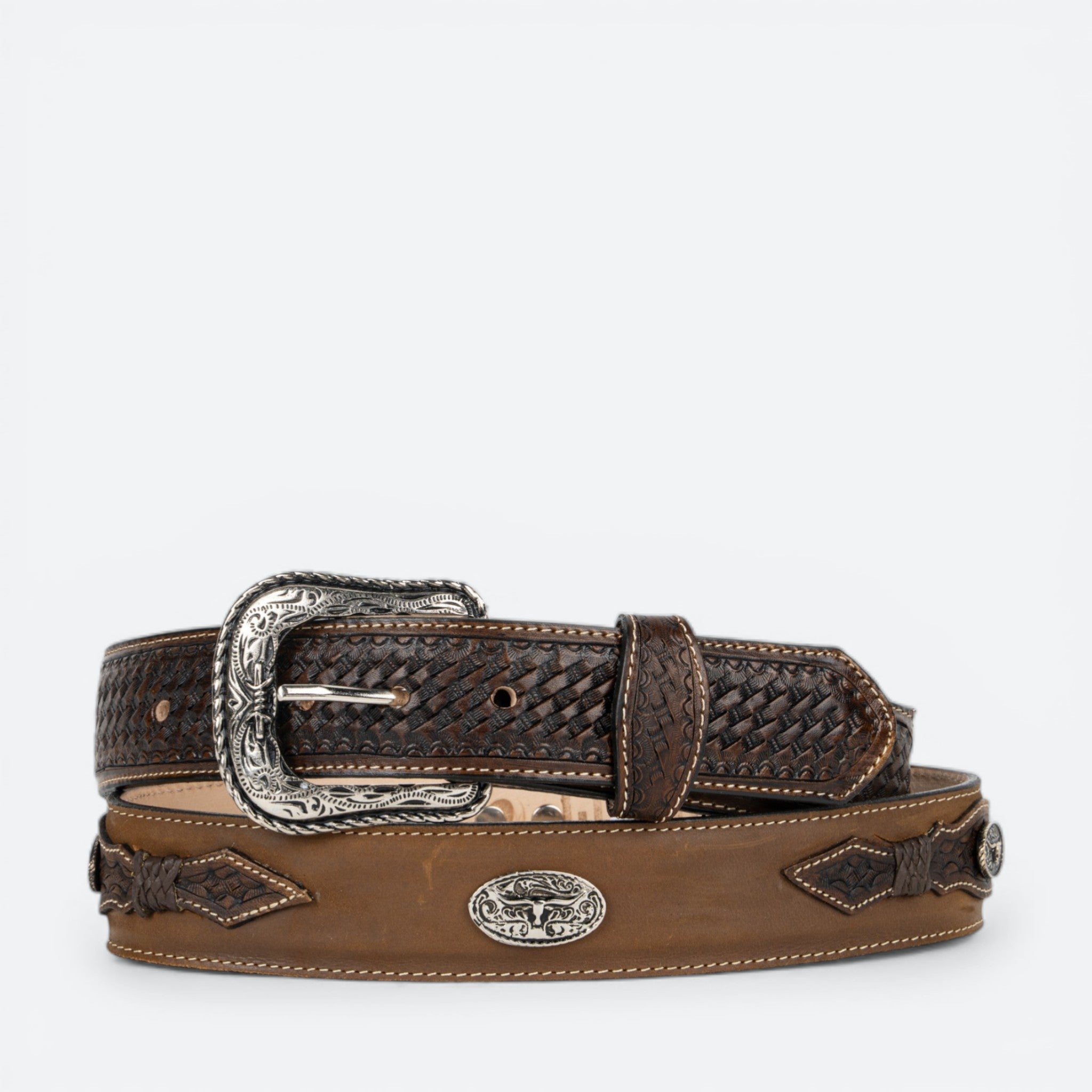 Cinturón vaquero grabado tejido y concho de toro, diseñado especialmente para caballeros que buscan autenticidad y estilo. Confeccionado con materiales de calidad, combina la tradición vaquera con un acabado elegante.