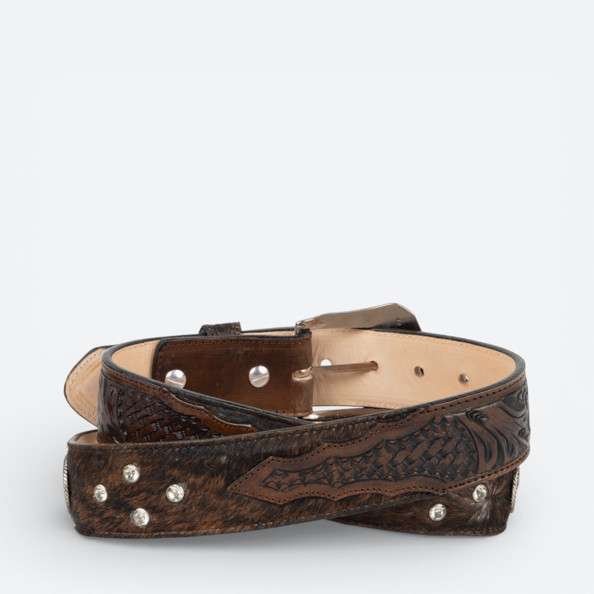 Cinturón de dama confeccionado en auténtico pelo de res, con acabado rodeo. Su tonalidad chocolate proporciona versatilidad para combinar con diferentes outfits, desde atuendos casuales hasta looks más elaborados.