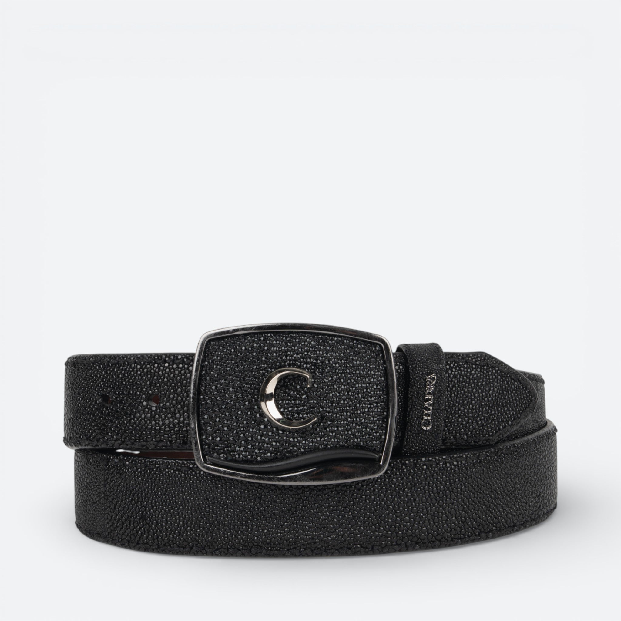 Cinturón vaquero para caballero en piel genuina de mantarraya y piel de bovino. Presenta aplicación en piel genuina de mantarraya en toda la tira. Hebilla de 45mm forrada en piel de mantarraya con aplicación metálica de monograma Cuadra y aplicación metálica en alto relieve. Con forro en piel de bovino