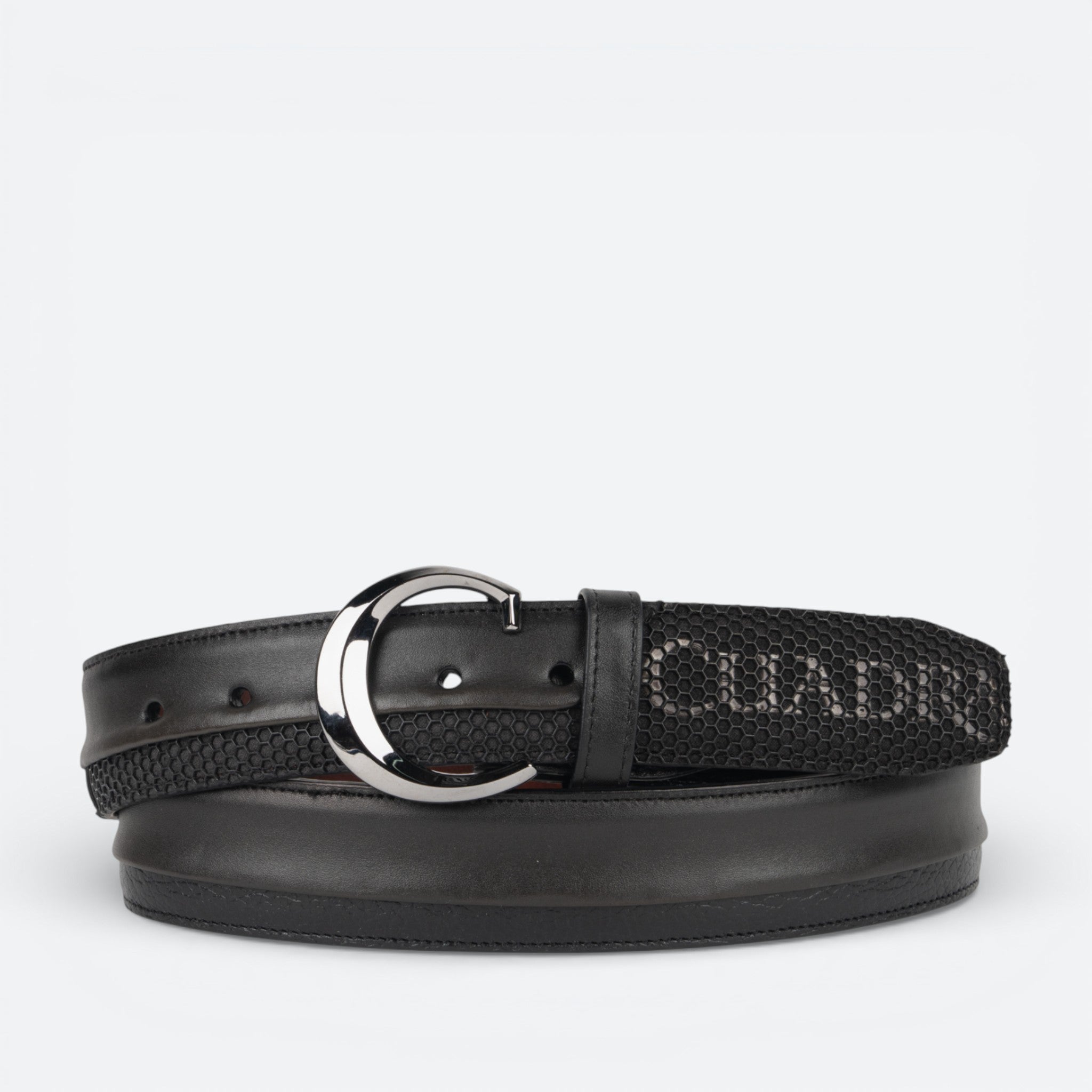 Cinturón casual para caballero en piel genuina de bovino. Presenta logotipo Cuadra encapsulado en diseño de microinyección de KPU en motivos geométricos. Con hebilla de 38mm del monograma Cuadra. Con f