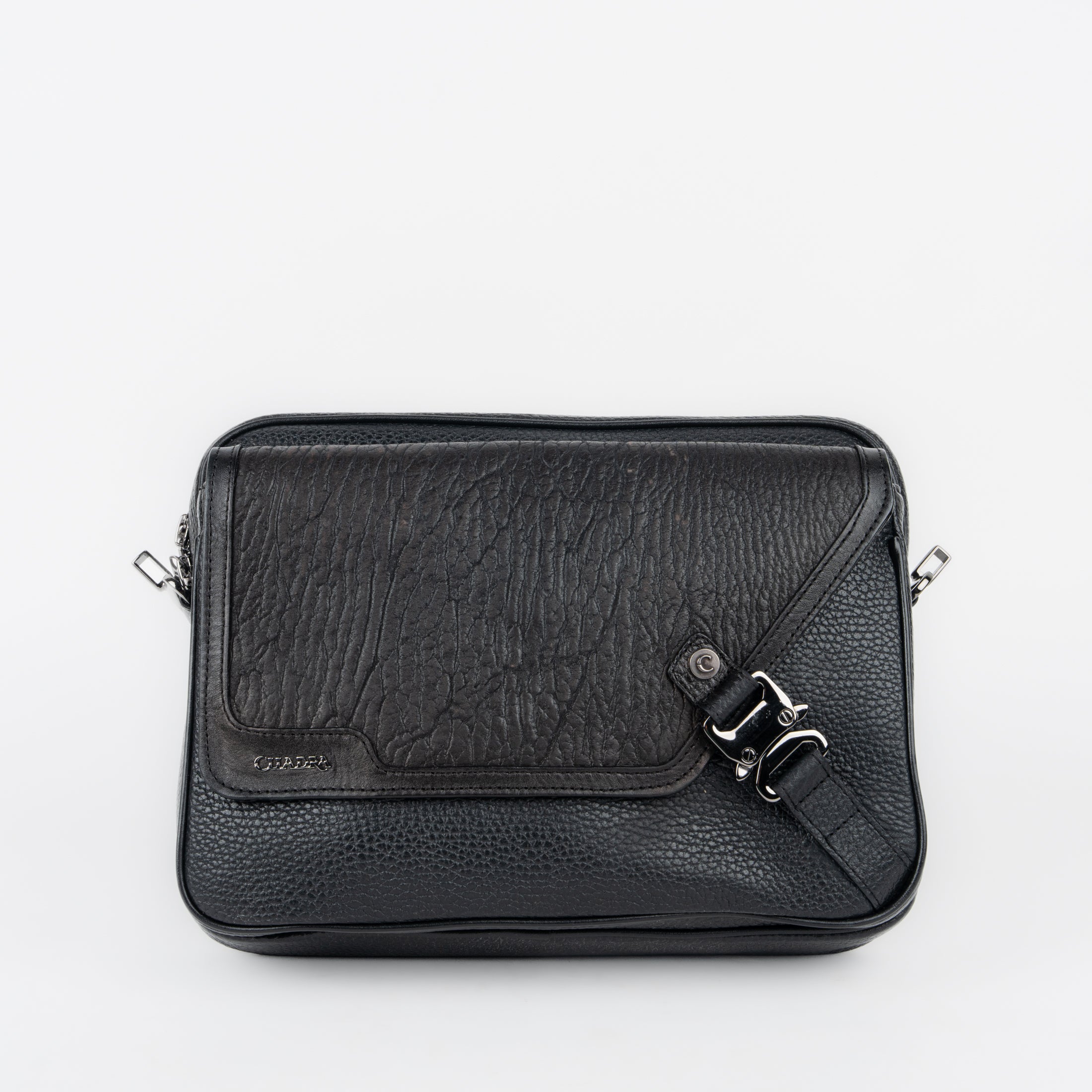 Bandolera para caballero en piel genuina de tiburón y piel de bovino. Cuenta con dos compartimentos: el primero asegurado con broche e imán, el de mayor tamaño con seis espacios para tarjetas, tres bolsillos internos y un bolsillo trasero asegurado con cierre. Con asa de textil ajustable.