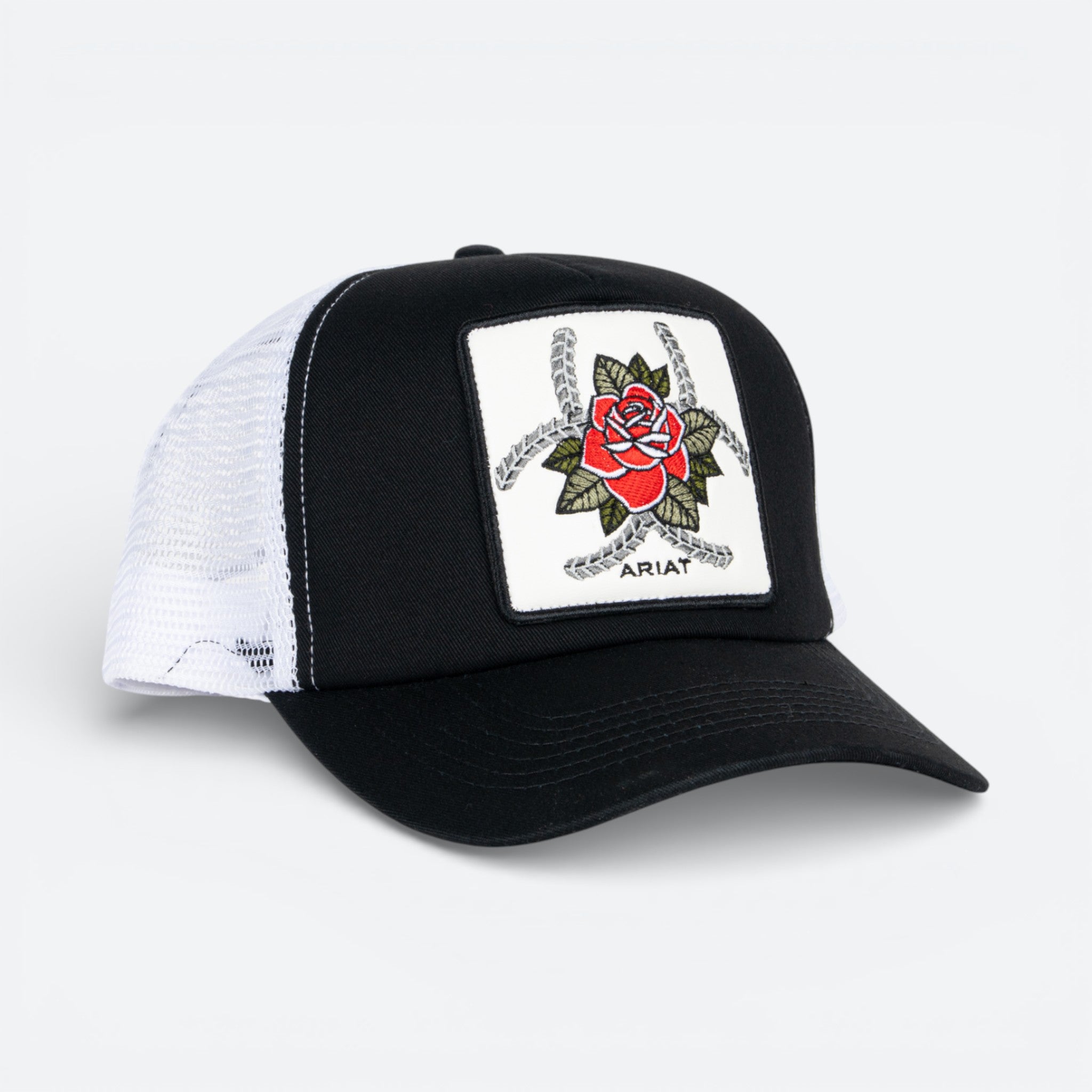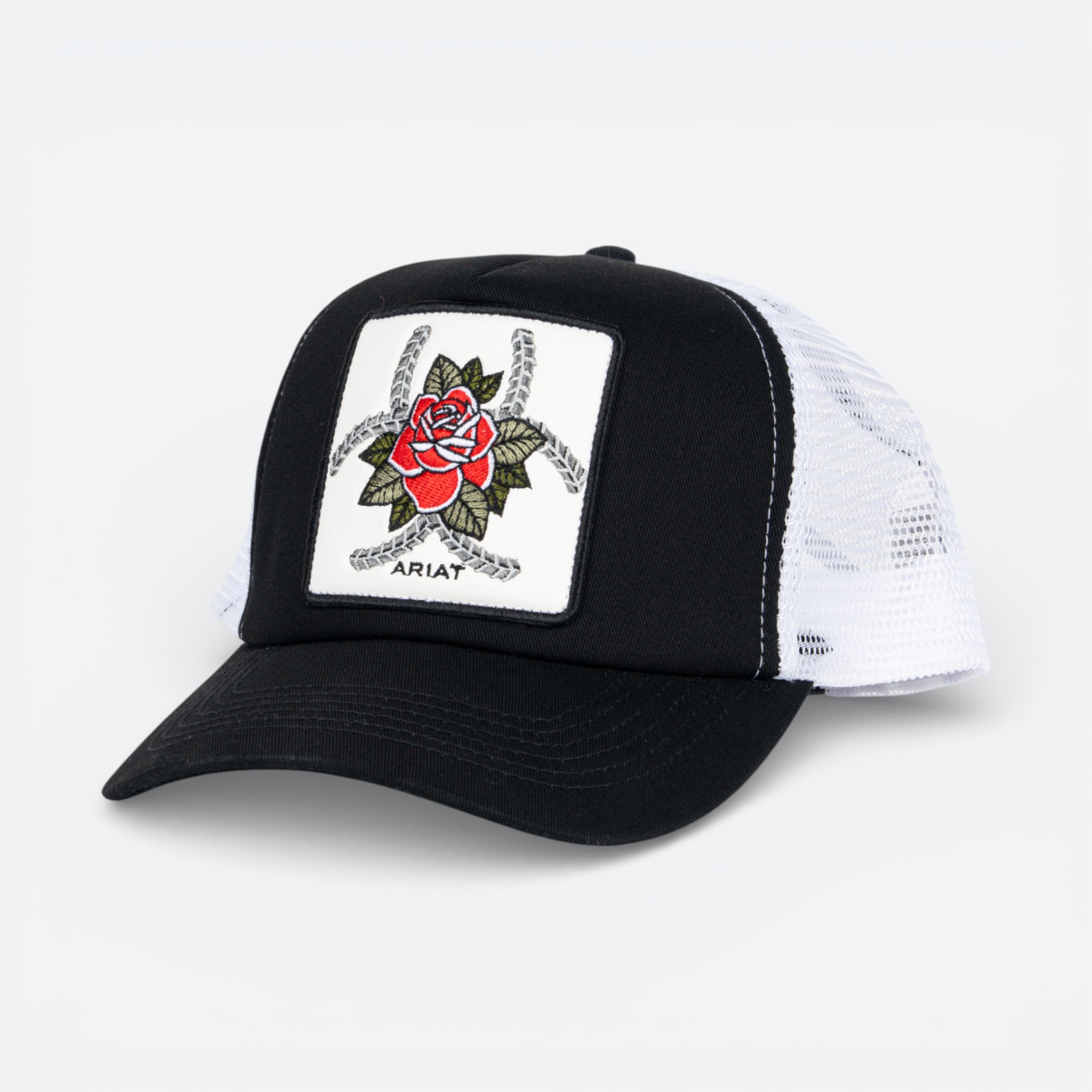 Gorra Ariat de calidad premium con un distintivo diseño de rosa tejida en color negro.