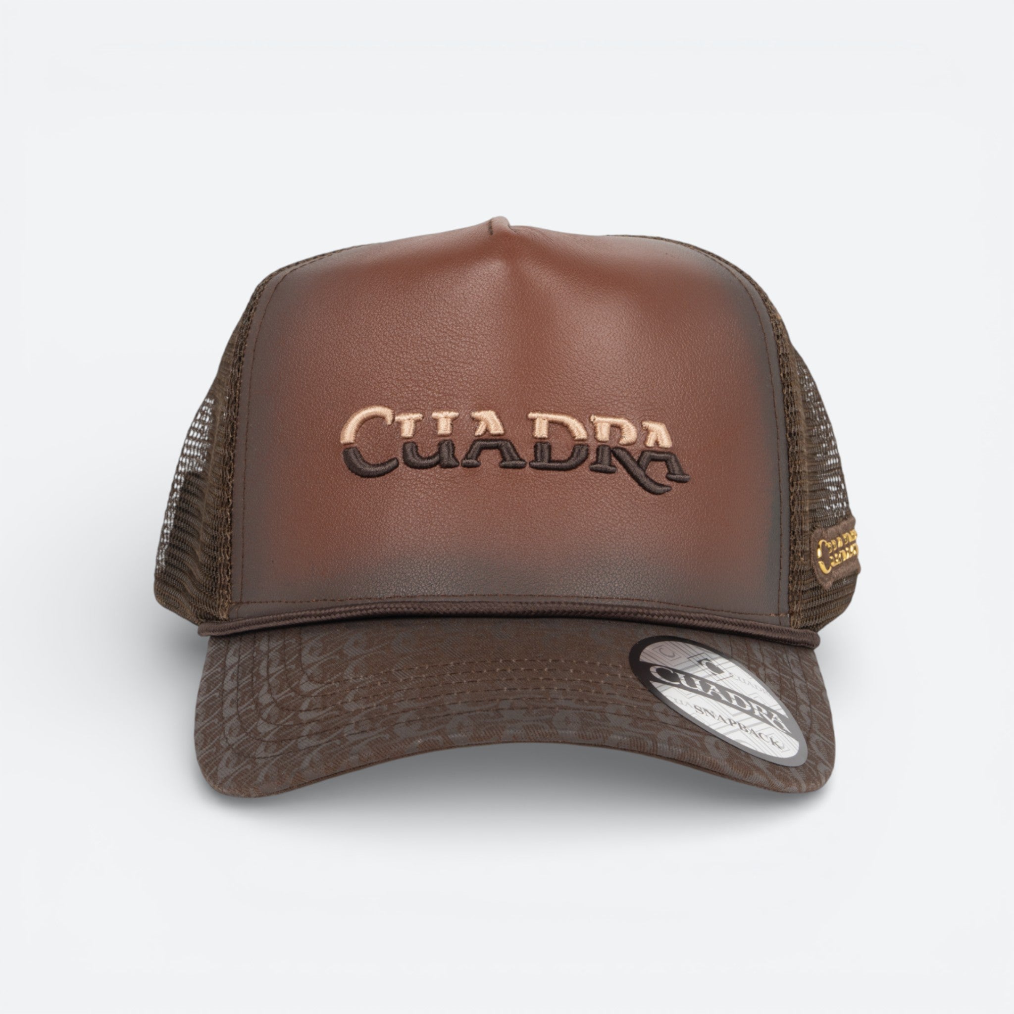 Gorra snapback con piel genuina de bovino y textil. Al frente presenta logotipo Cuadra en alto relieve sobre piel genuina con acabado pintado a mano. Con grabado del monograma Cuadra en visera.