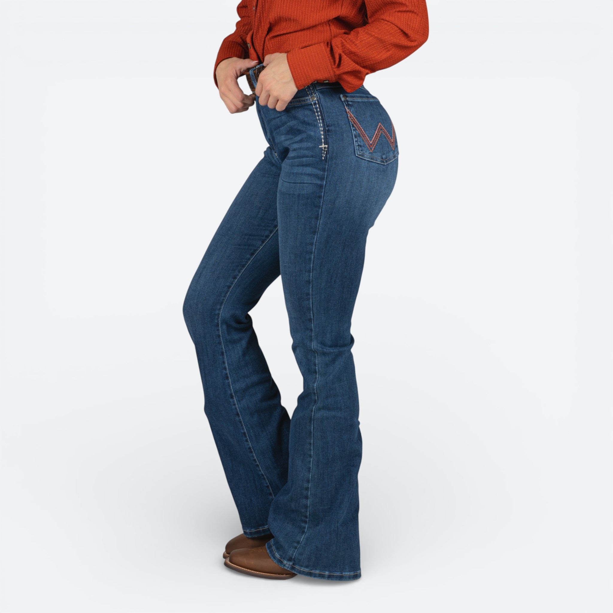 Jeans Wrangler Flare Cintura Alta con corte acampanado que define la silueta. Diseñados con cintura alta para mayor comodidad y control, estos jeans combinan el estilo clásico de Wrangler con tendencias.